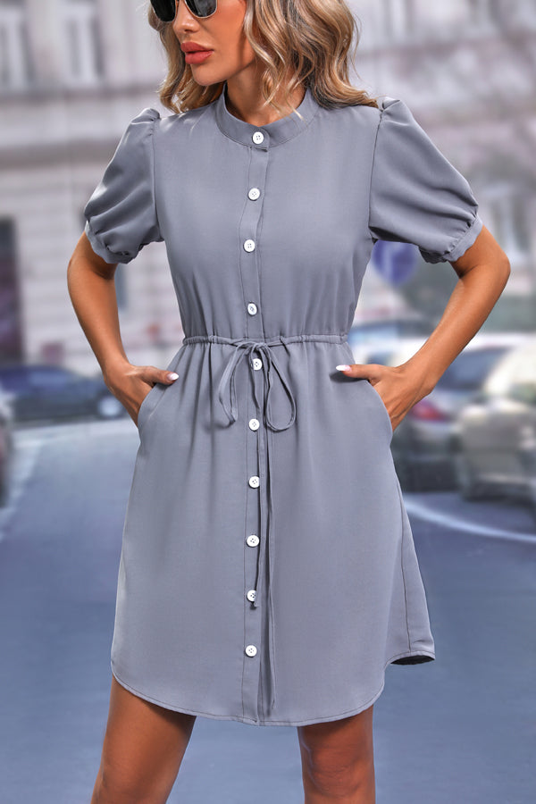 Button Drawstring Waist Casual Dress