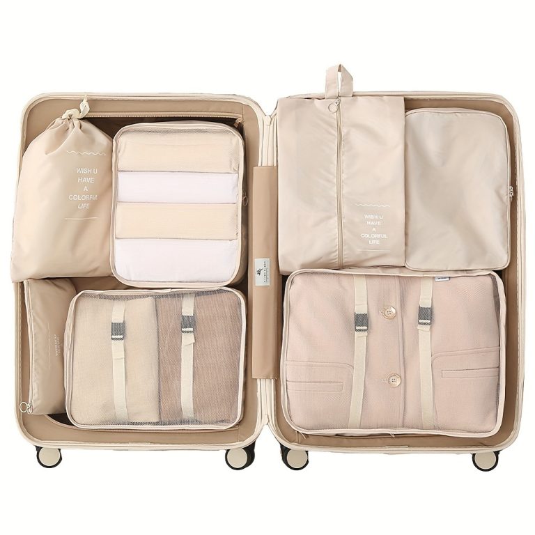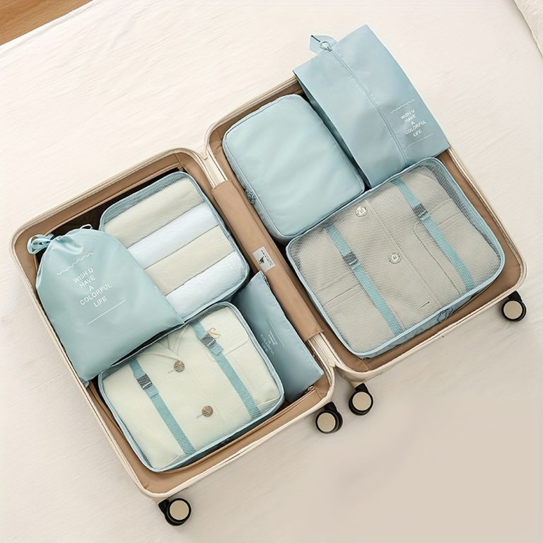 7pcs Large Capacity Travel Organizer Set, Nylon Packing Cubes With Storage Pouch For Clothes, Pants, Shoes, Socks – Vacation Style, Portable Luggage Bags