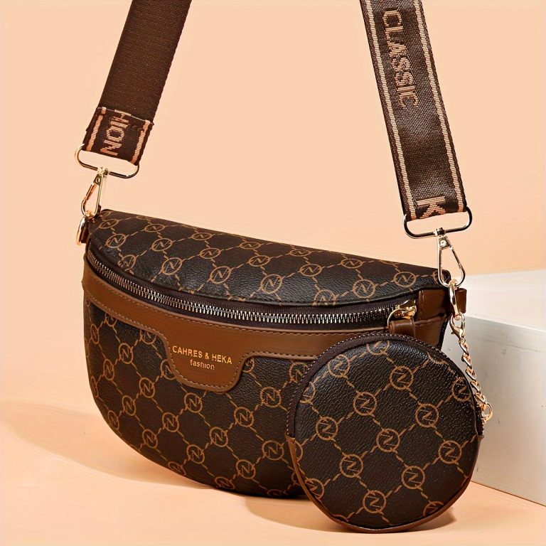 Classic Textured Crescent Crossbody Bag, Vintage Zipper Chest Bag With Round Mini Purse For Women