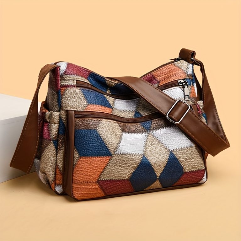 Geometric Patchwork Crossbody Bag for Women, Vintage Style, Color Block Pattern with PU Material, Multi-Layer Shoulder Purse for Daily Use