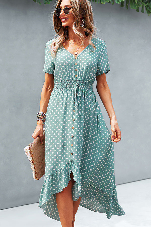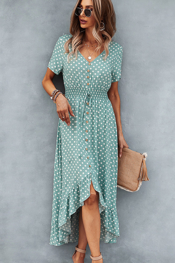 Dots Print High Waist V Neck Casual Dress