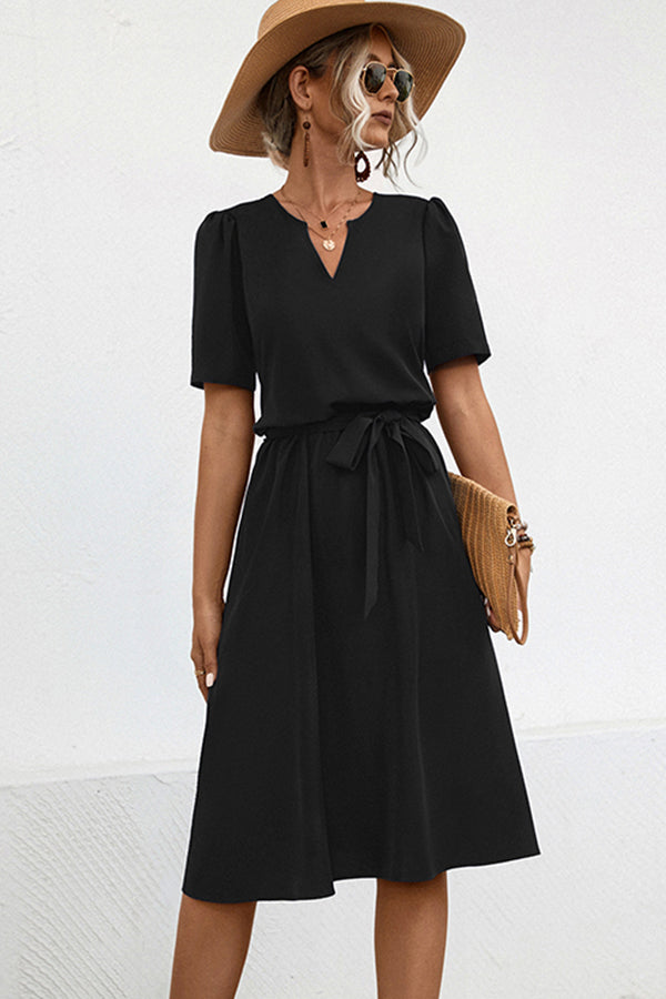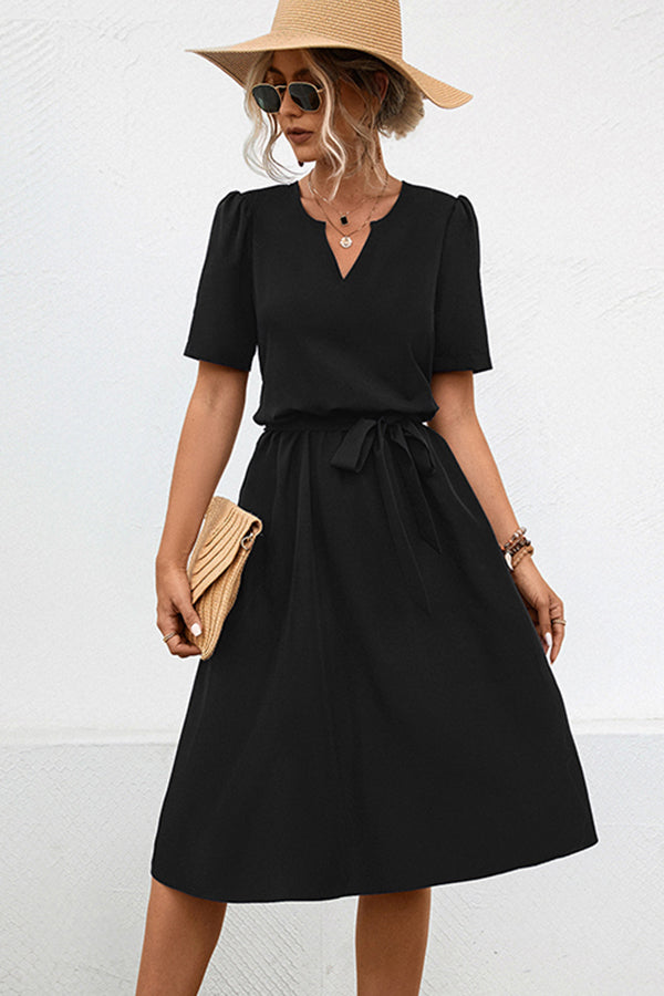 Solid Color V Neck Tie Waist Casual Dress
