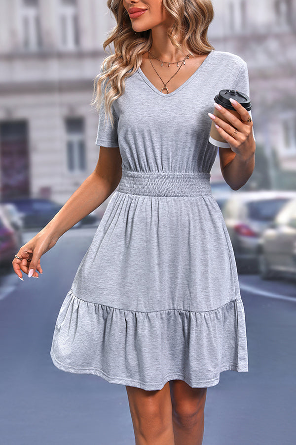 Solid Color V Neck Short Sleeve Casual Mini Dress