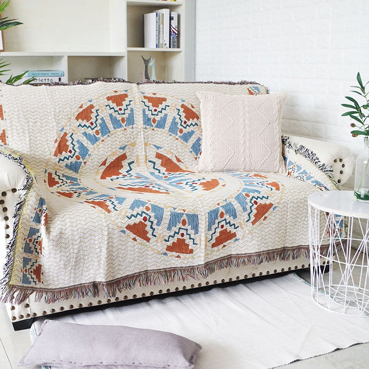 White Knitted Boho Sun Emblem Sofa Throw Cover Blanket