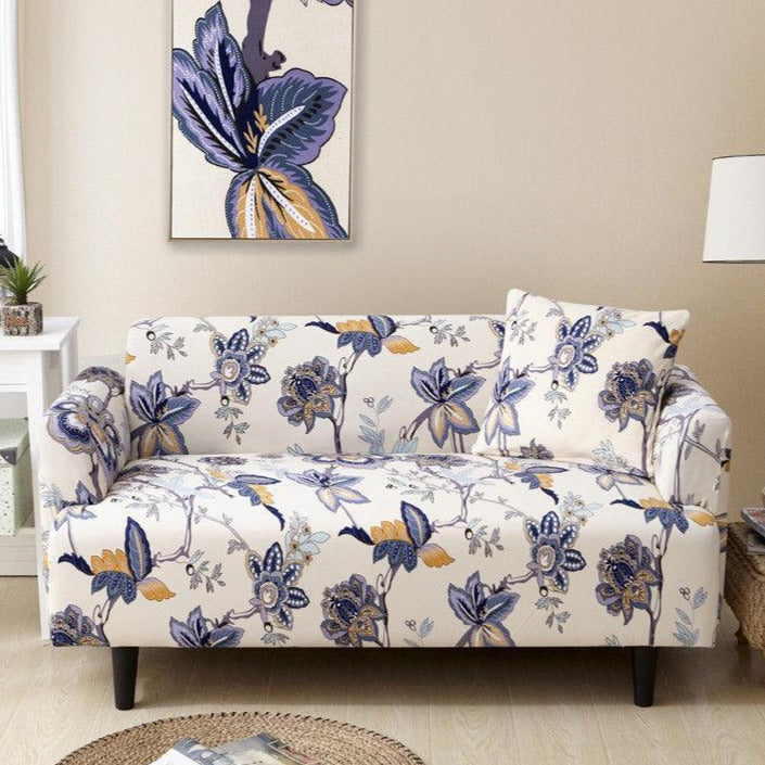 Abstract Ivory / Blue Floral Pattern Sofa Couch Cover