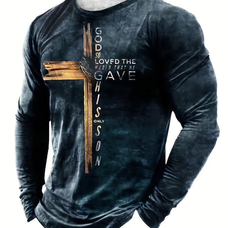Classic Cross And Letter Print Men’s Creative Long Sleeve Crew Neck T-shirt For Spring Fall, Gift For Men