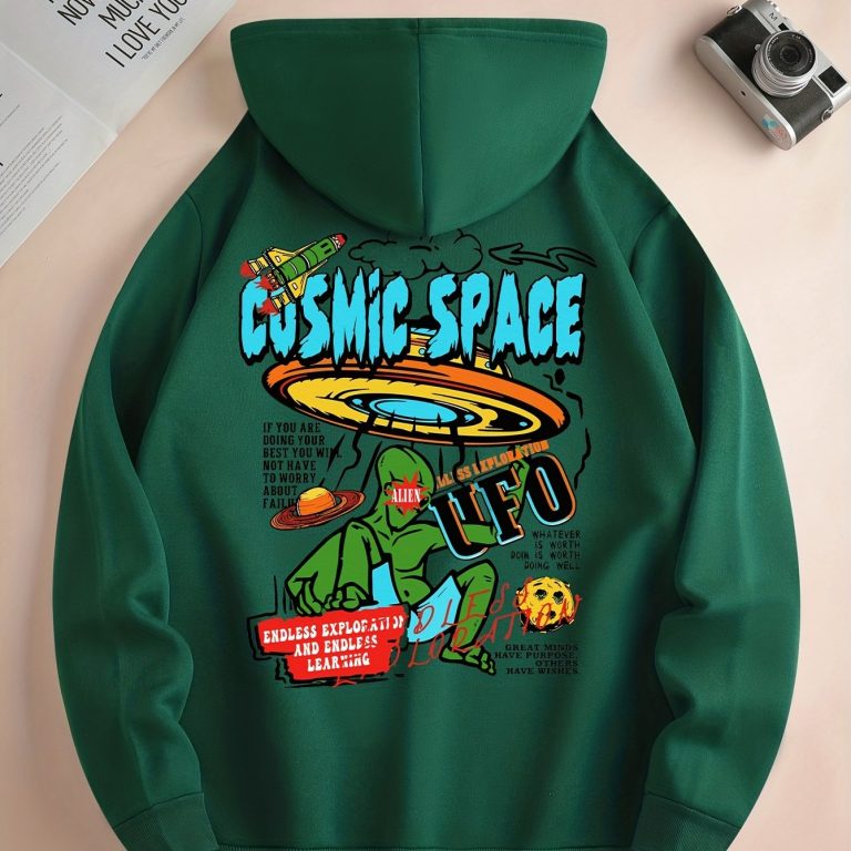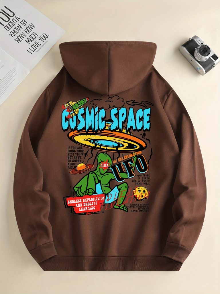 UFO & Alien Print Hoodie, Cool Hoodies For Men, Men’s Casual Graphic Design Pullover Hooded Sweatshirt With Kangaroo Pocket Streetwear For Winter Fall, As Gifts