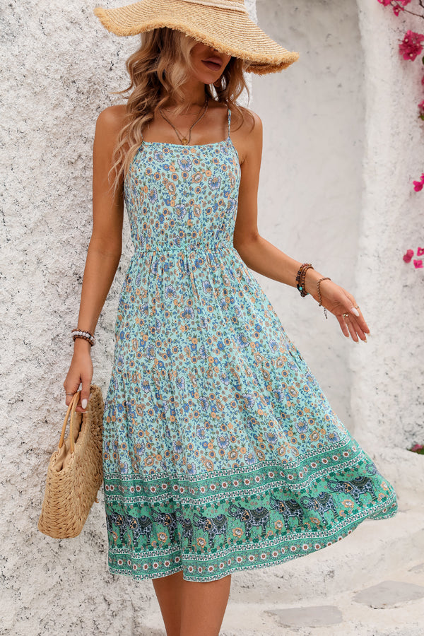 Fashion Printed Tie Shoulder Smocked Maxi Dress