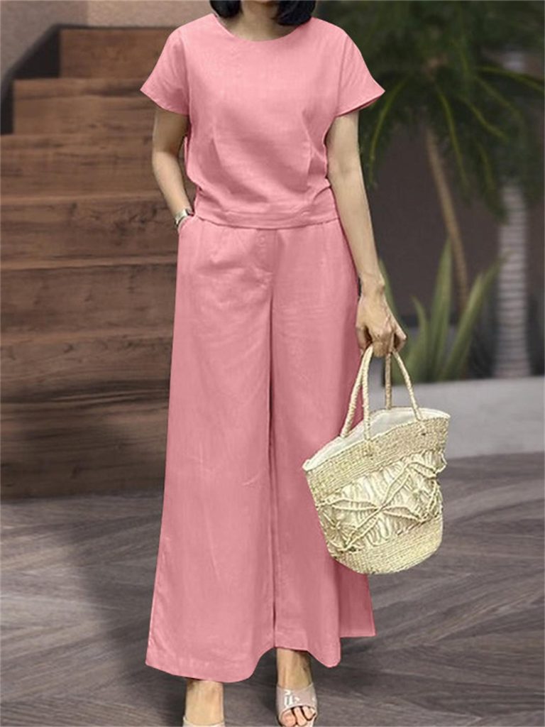 Loose Solid Color Two-piece, Crew Neck Short Sleeve T-shirt & Dual Pocket Pants Outfits, Women’s Clothing