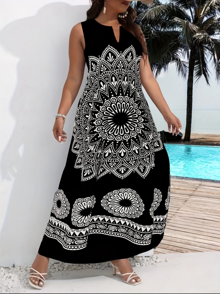 Mandala Floral Print Maxi Dress, Elegant Notched Neck Sleeveless Dress, Women’s Clothing