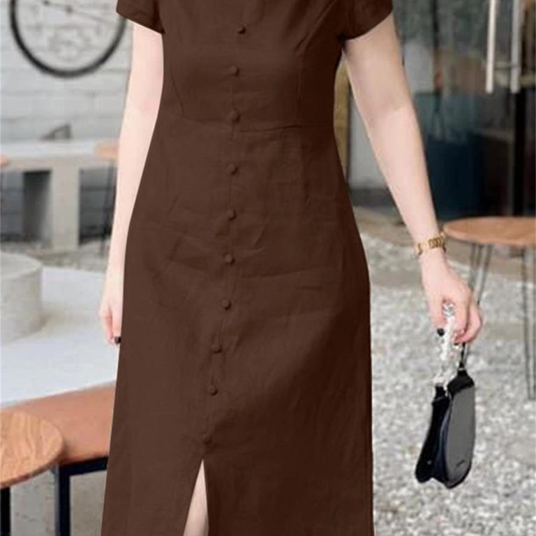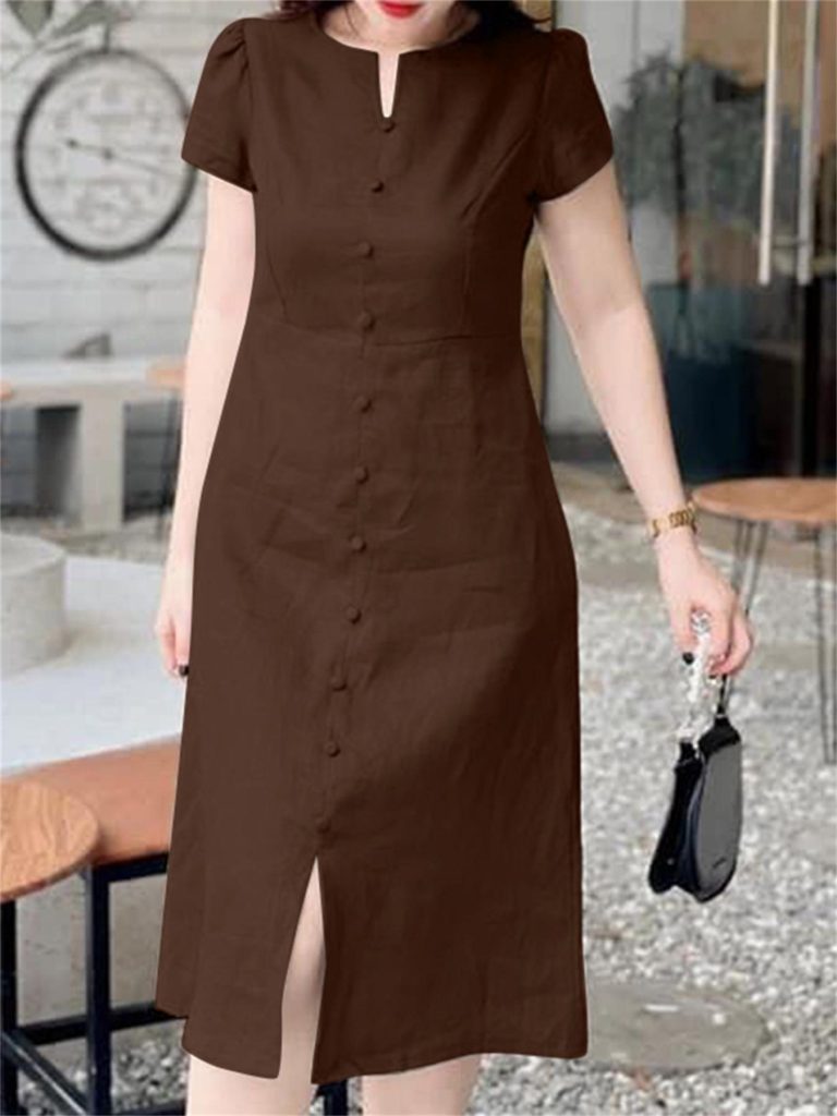 Solid Color Notched Neck Dress, Casual Short Sleeve Button Front Split Dress For Spring & Summer, Women’s Clothing