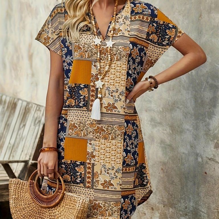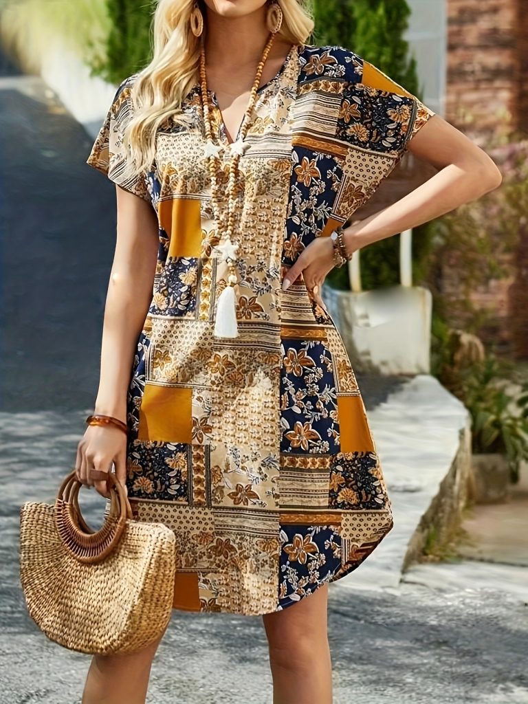 Patchwork Print Curvy Hem Dress, Vacation Short Sleeve Notched Neck Dress, Women’s Clothing