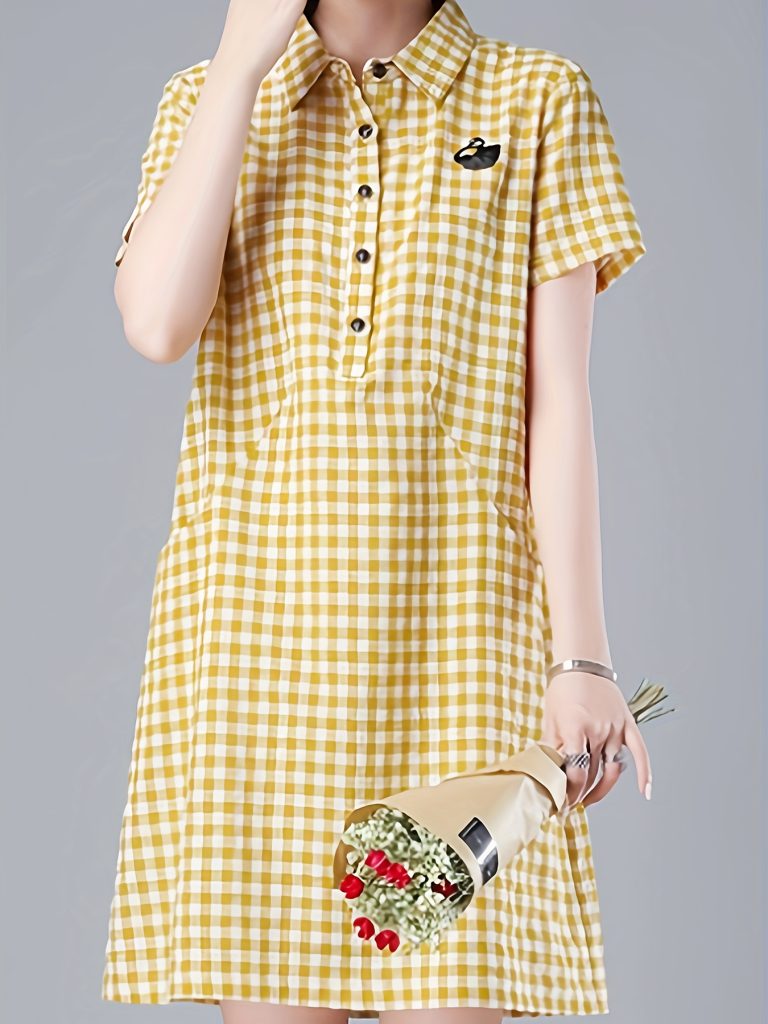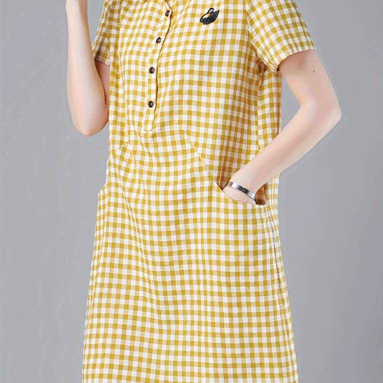 Plaid Print Button Up With Pocket Dress, Casual Short Sleeve Loose Dress For Spring & Summer, Women’s Clothing