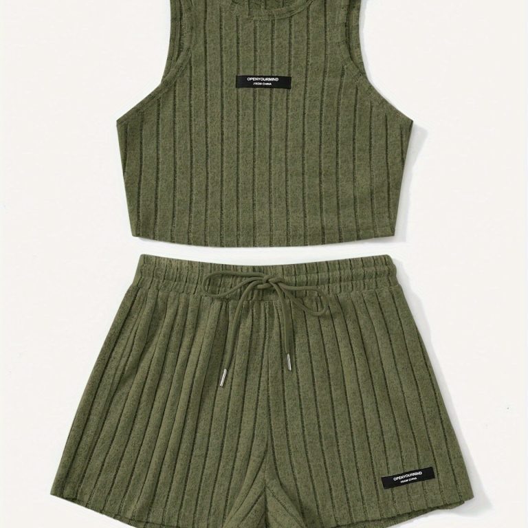Ribbed Casual Two-piece Set, Crew Neck Sleeveless Tank Top & Drawstring Shorts Outfits, Women’s Clothing