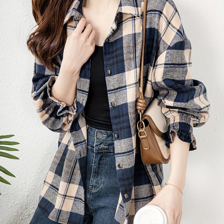 Plaid Print Button Front Blouse, Casual Long Sleeve Blouse For Spring & Fall, Women’s Clothing