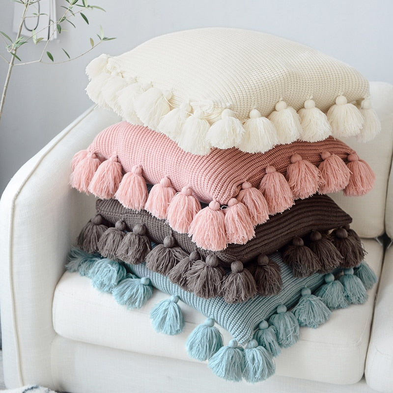 18″ Solid Knitted Cotton Throw Pillow Cover w/ Tassels
