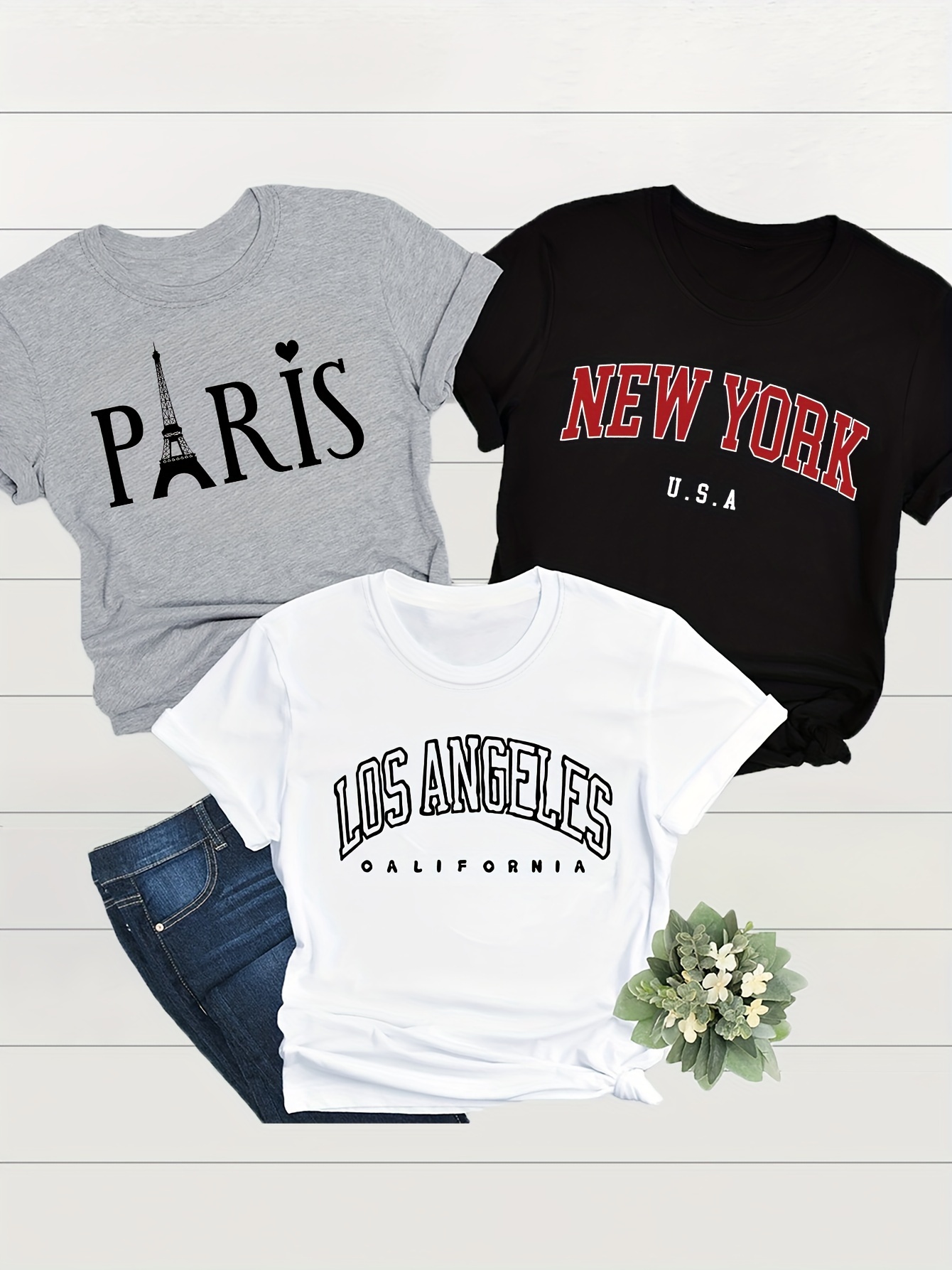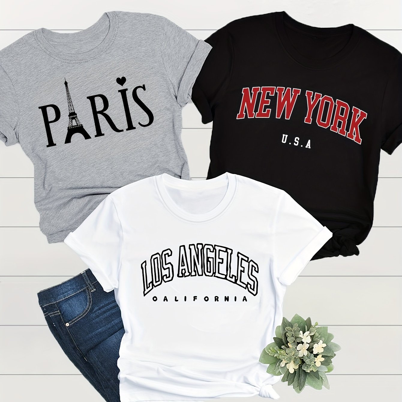 3 Pack Eiffel Tower Print Crew Neck T-Shirt, Casual Short Sleeve T-Shirt For Spring & Summer, Women’s Clothing