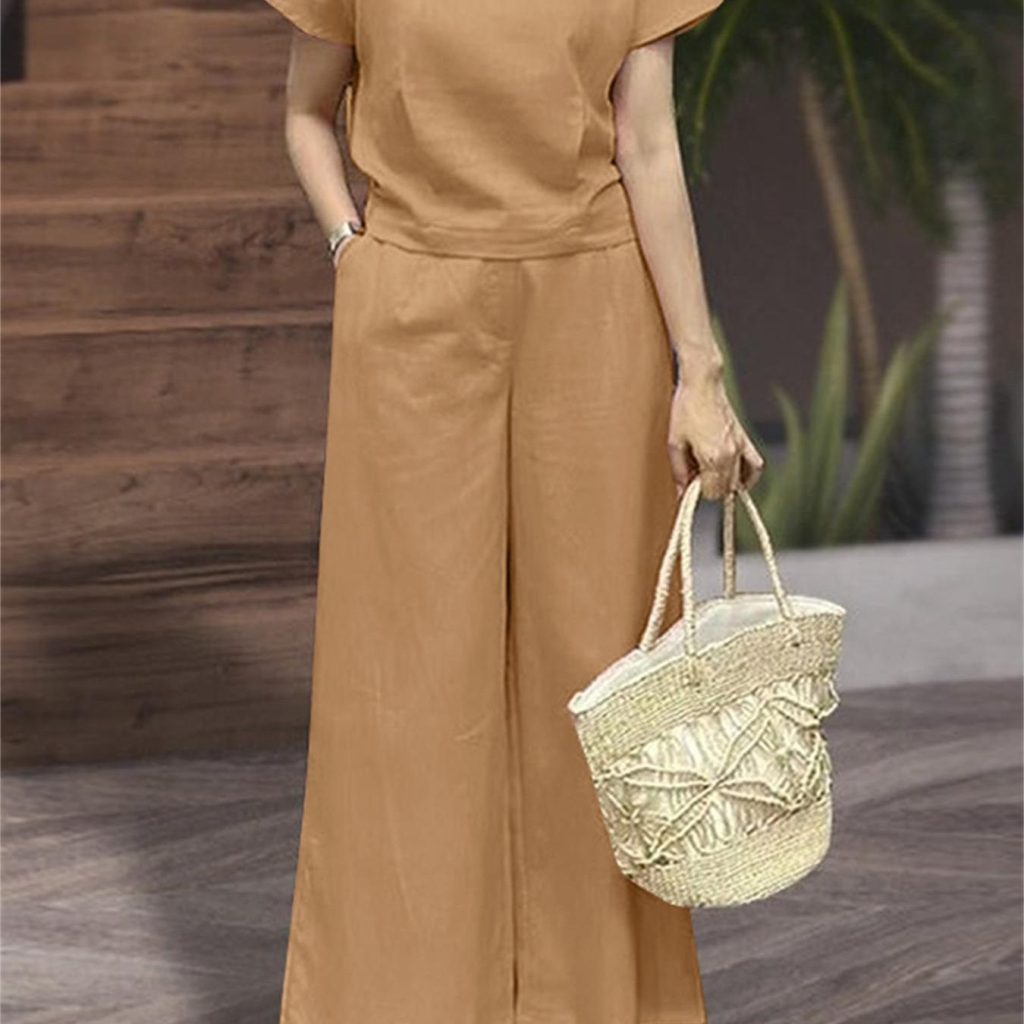 Loose Solid Color Two-piece, Crew Neck Short Sleeve T-shirt & Dual Pocket Pants Outfits, Women’s Clothing