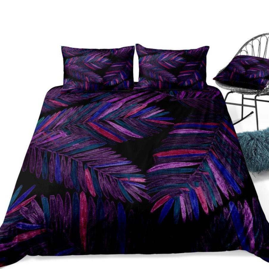 Black 2/3-Piece Purple Tropical Palm Leaf Duvet Cover Set