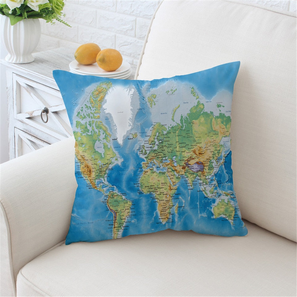 Blue Classic World Map Microfiber Throw Pillow Cover