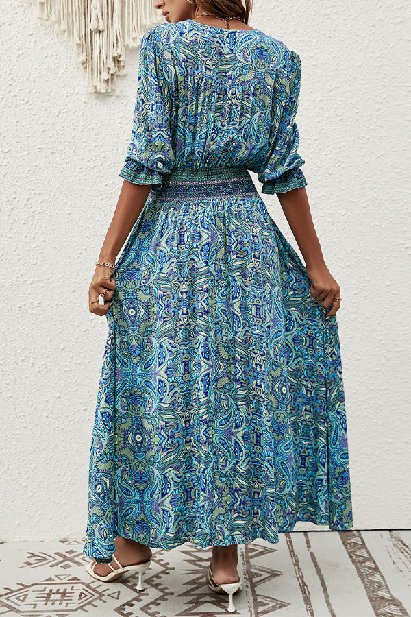 Bohemia Print Long Sleeve Tie Waist Maxi Dress