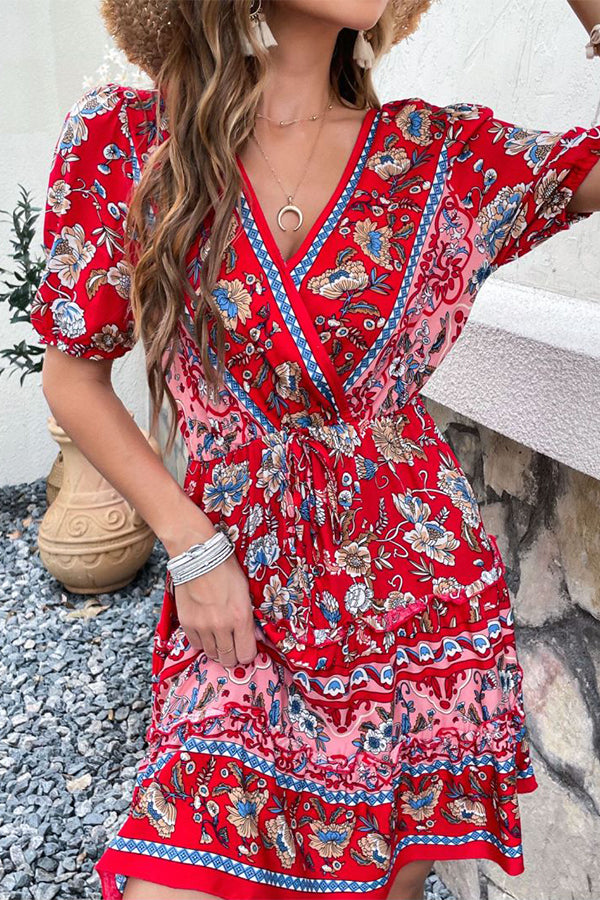 Bohemia Print V Neck Short Sleeve Mini Dress