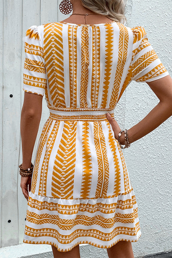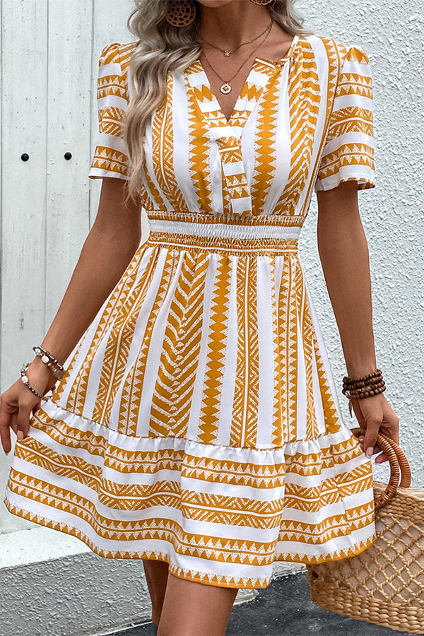Bohemia Print V Neck Smocked Waist Mini Dress