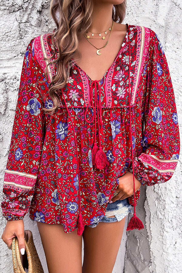 Bohemian Floral Print V Neck Casual Tops