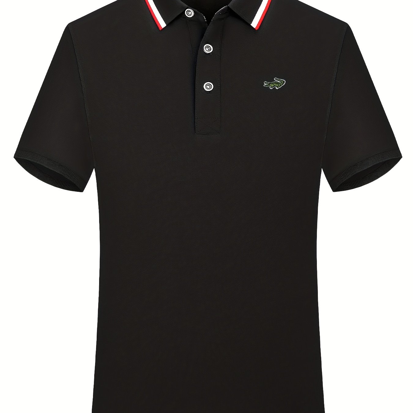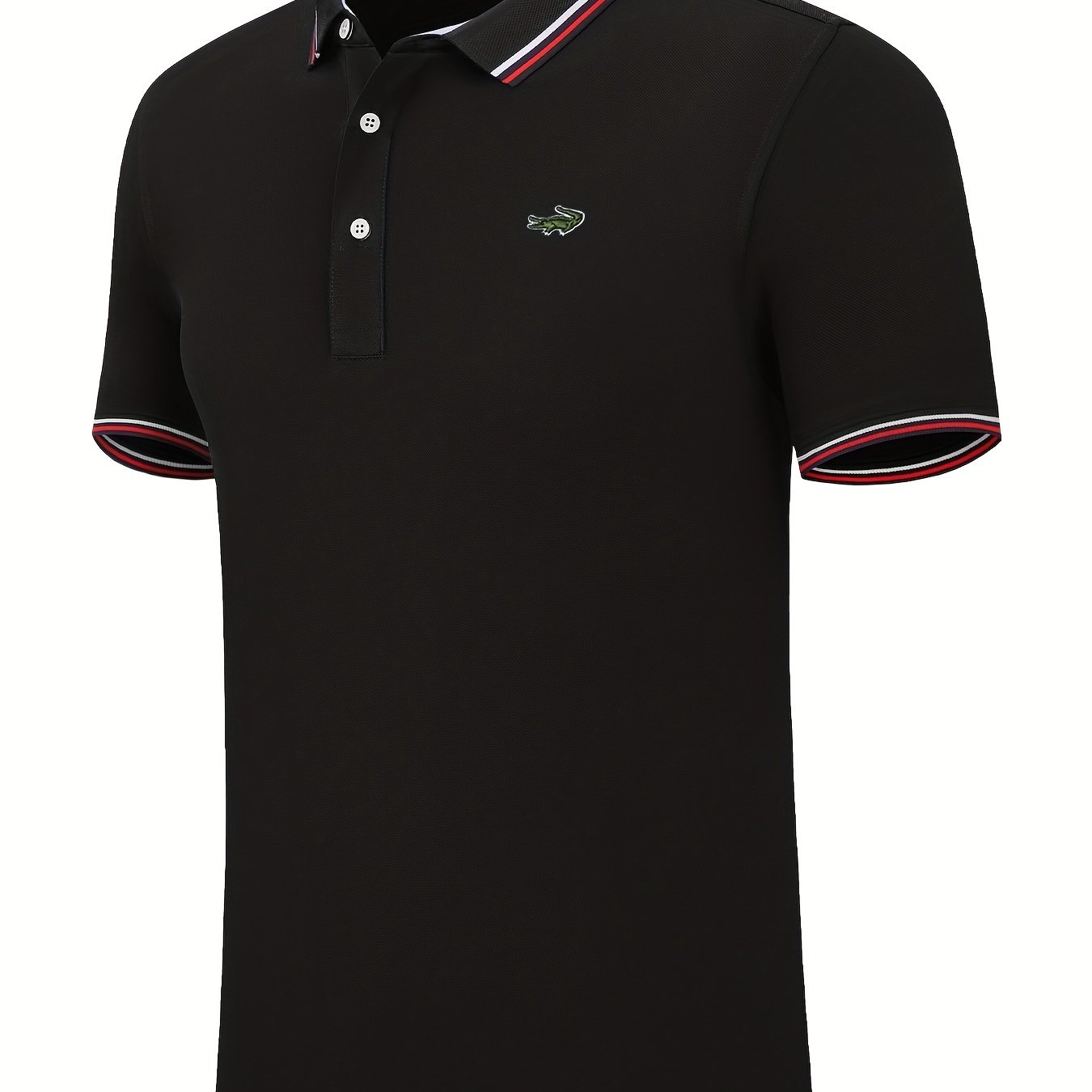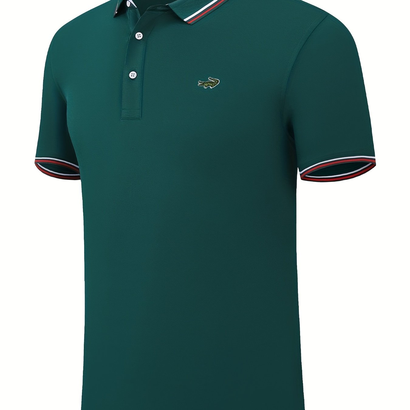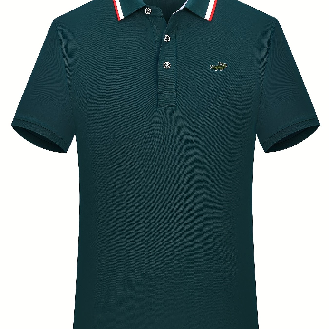 Breathable Embroidered Shirt, Men’s Casual Crocodile Pattern Stripe Lapel Button Up Golf Shirt For Summer