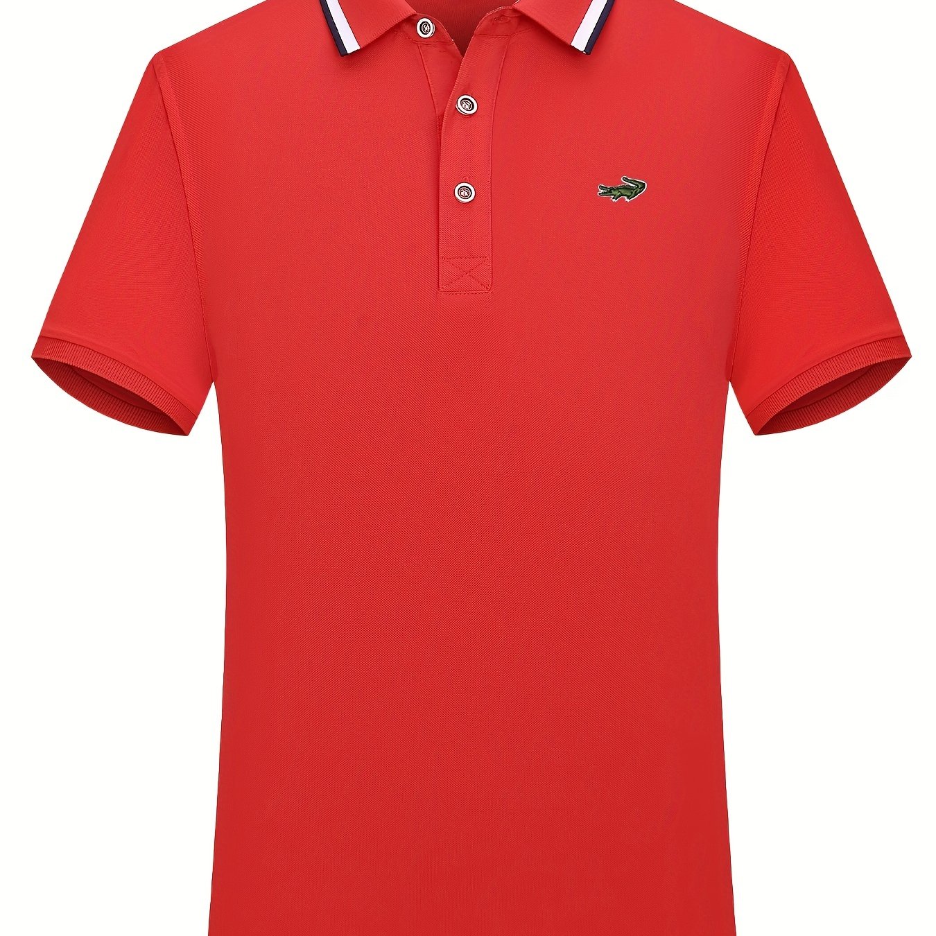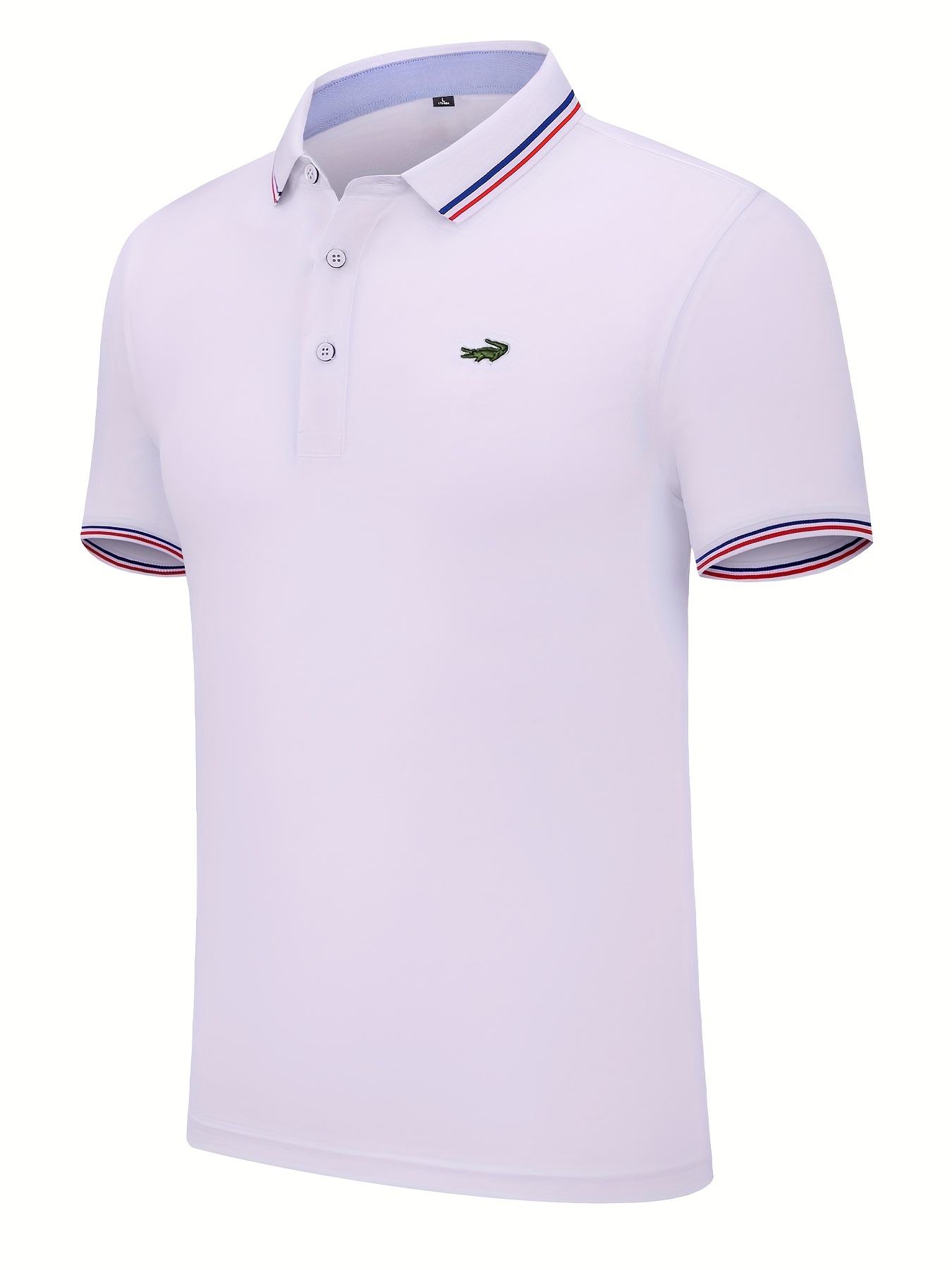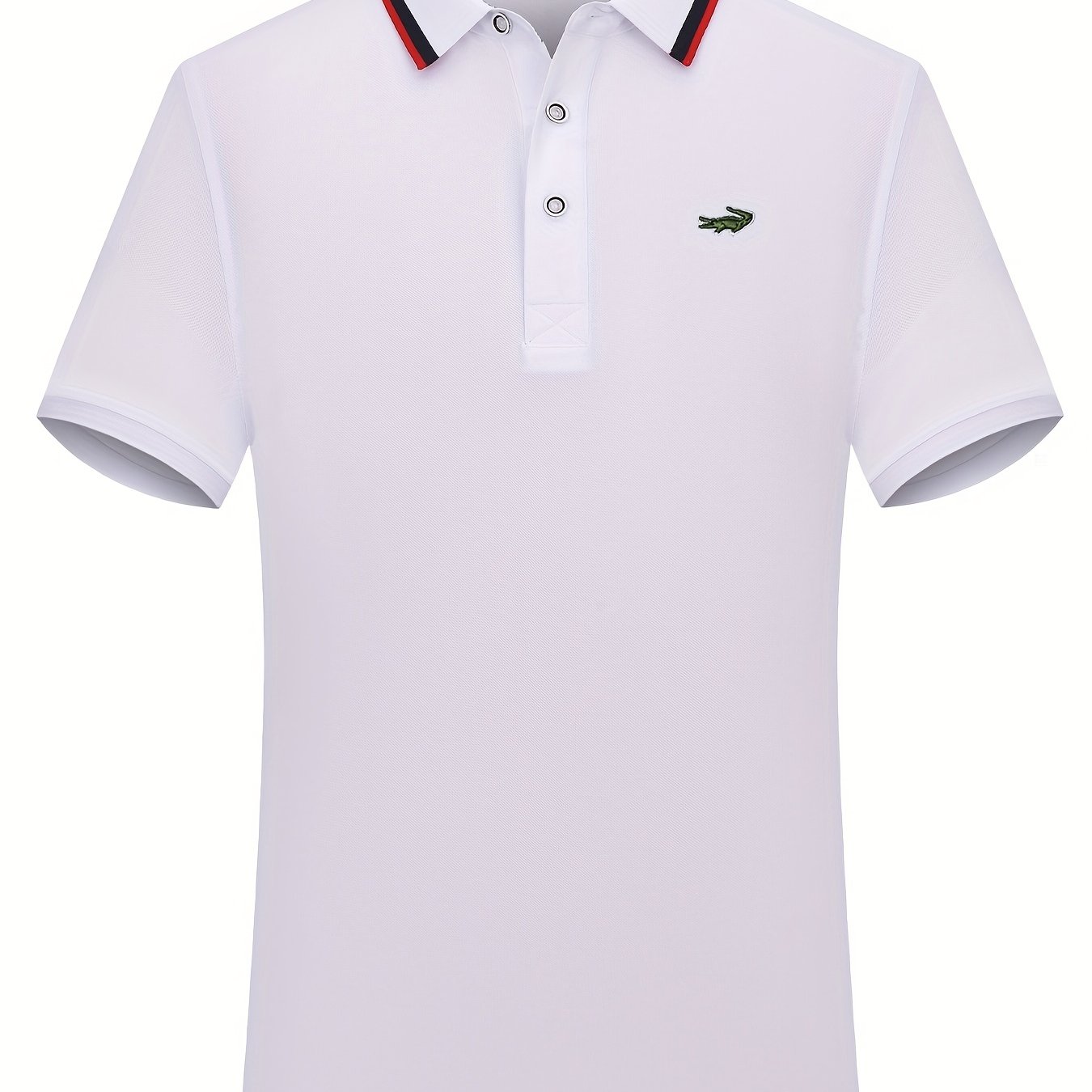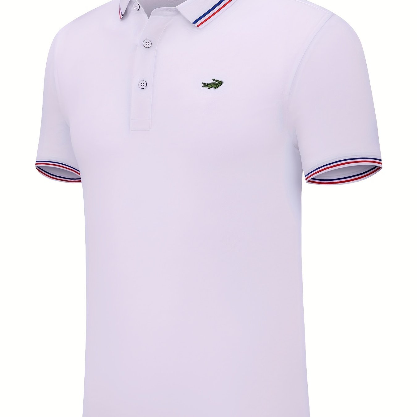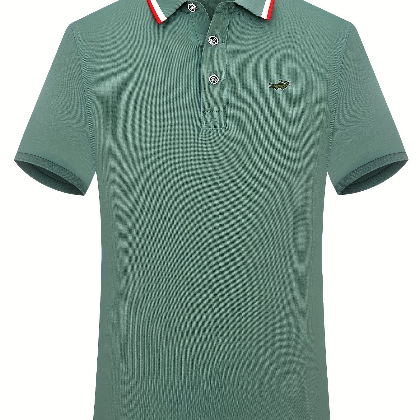 Breathable Embroidered Shirt, Men’s Casual Crocodile Pattern Stripe Lapel Button Up Golf Shirt For Summer