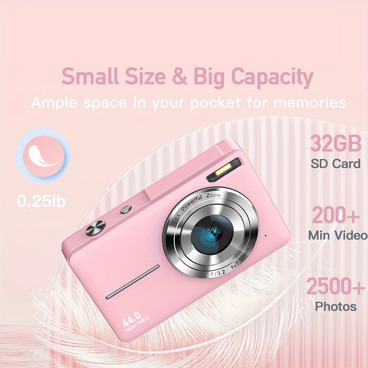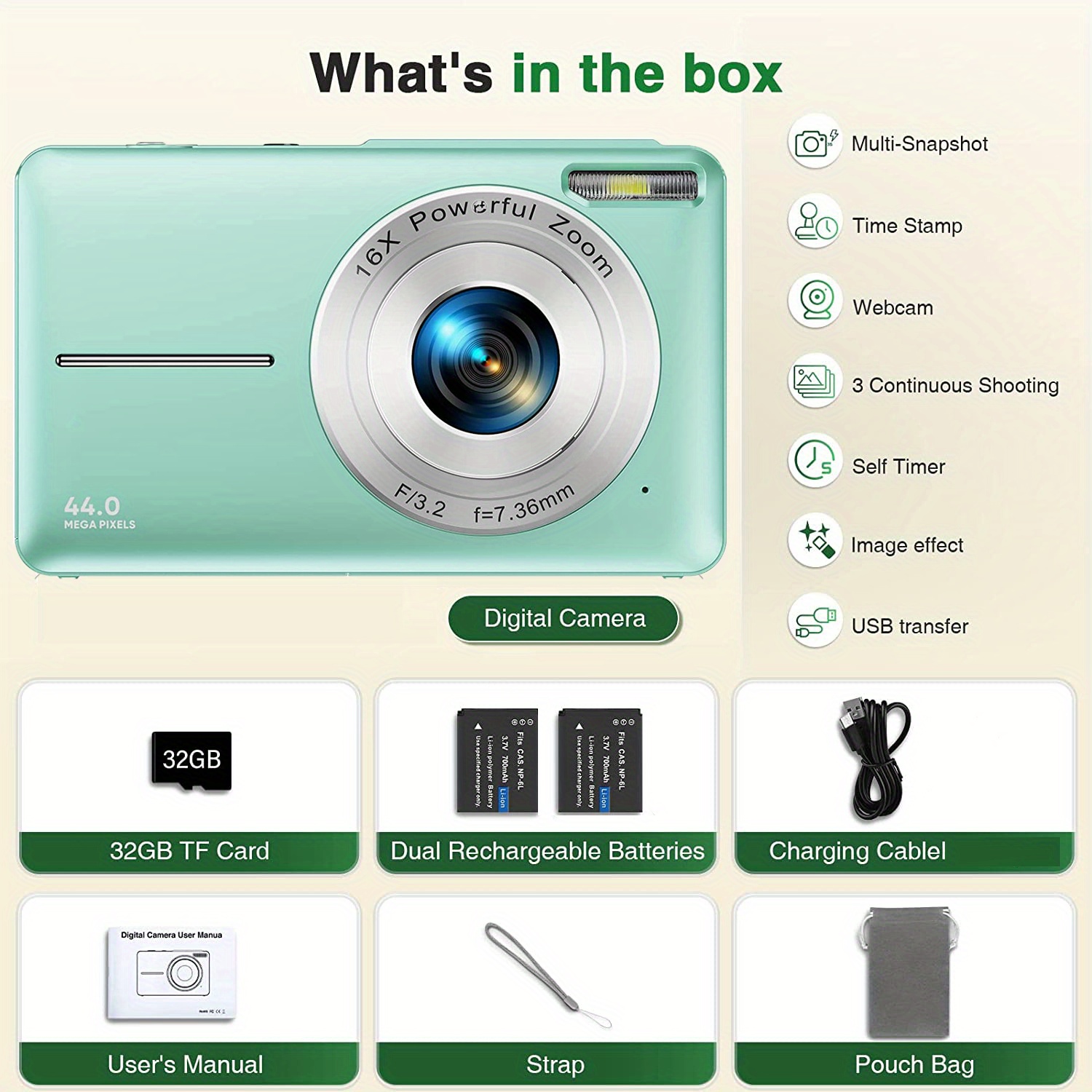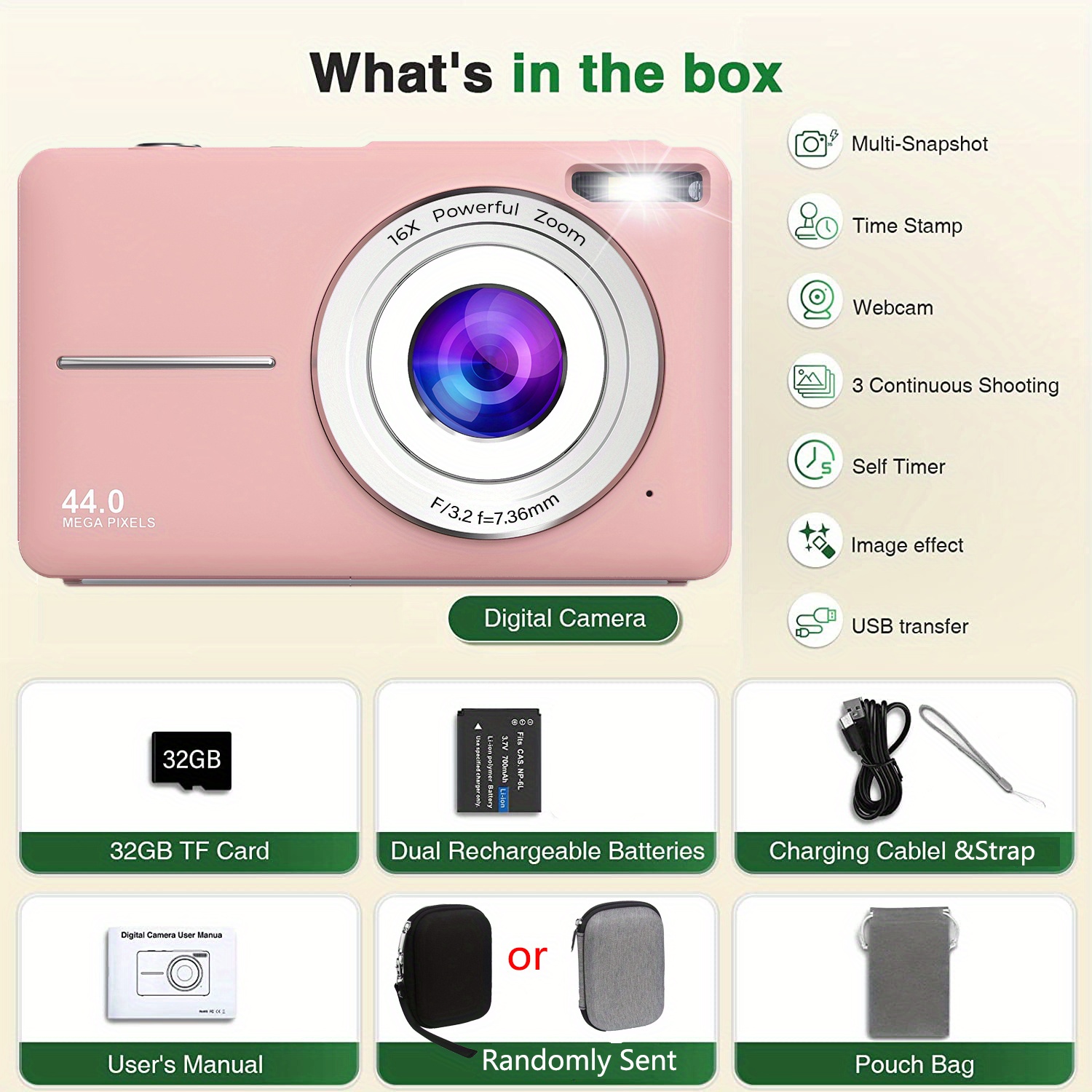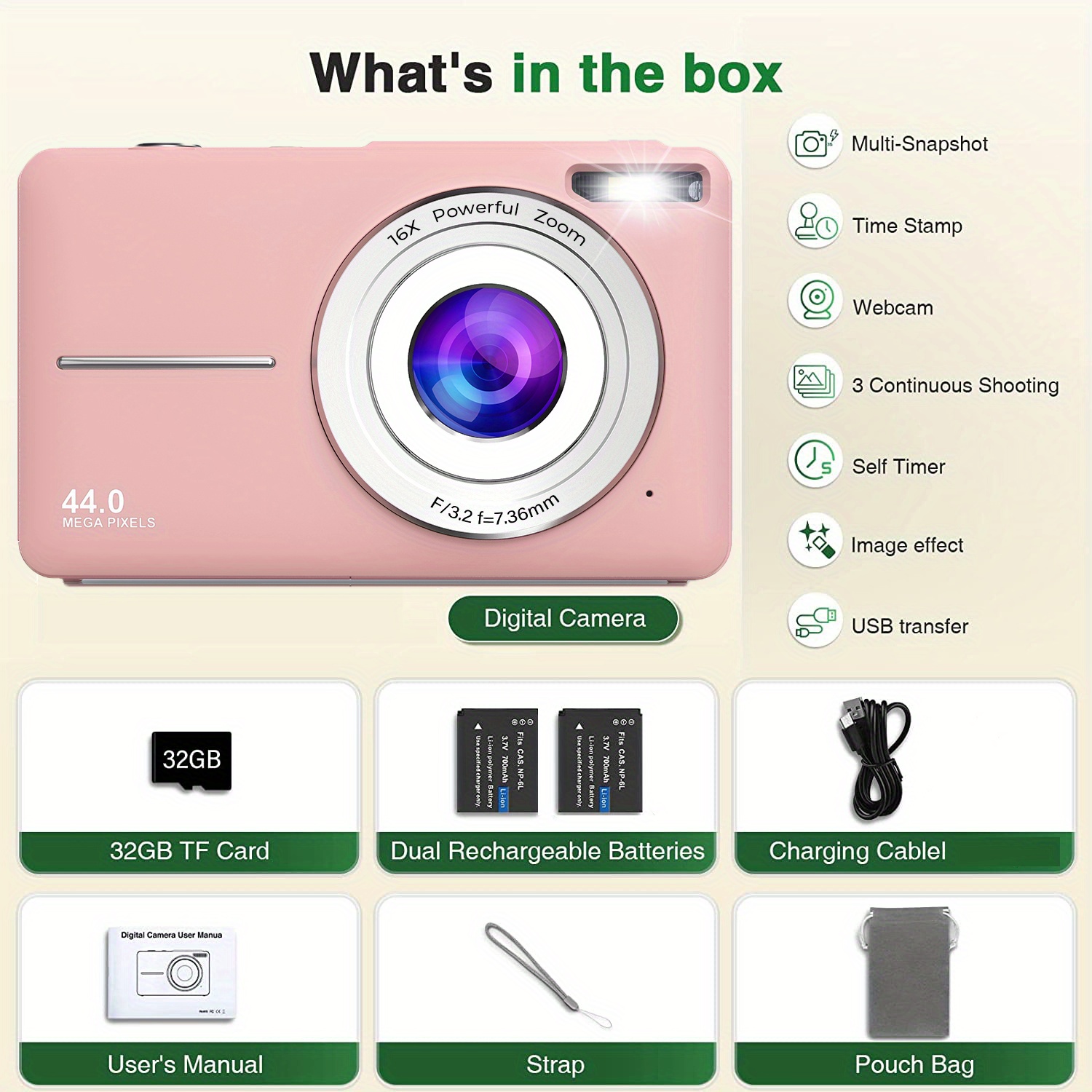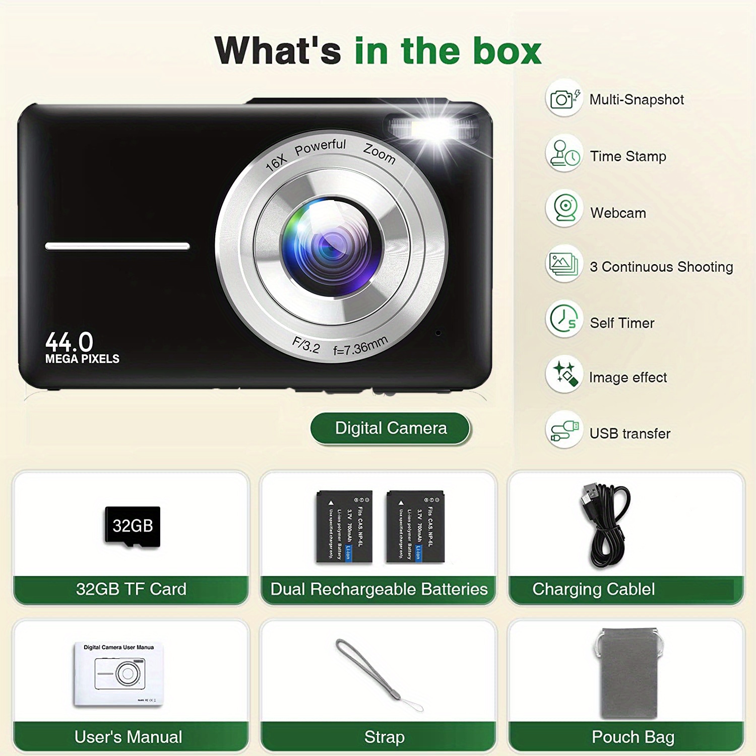 DC403 44MP 1080P HD Digital Camera 16X Digital Zoom Cameras For Vlogging 6.1 Cm LCD Rechargeable Camera Photography Professional Camera For Teenagers, And Beginners With 32G TF Card, Support For Taking Photos, Recording Videos, And Webcam, For Thanksgivin