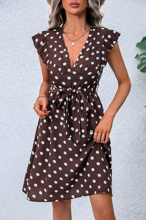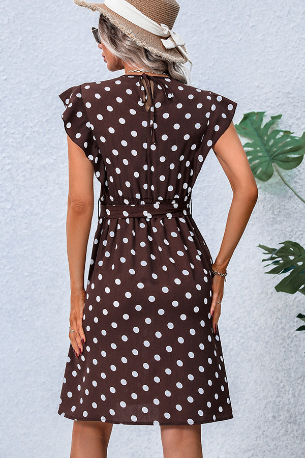 Dots Print V Neck Tie Waist Dress