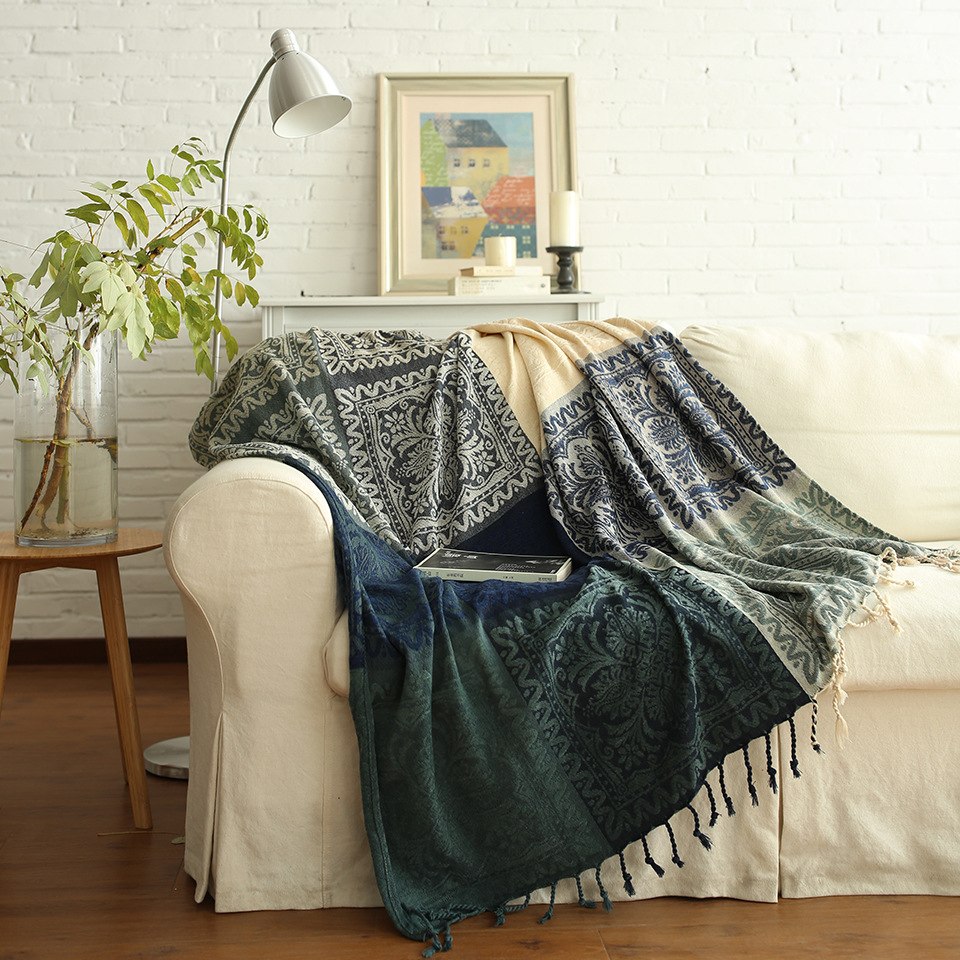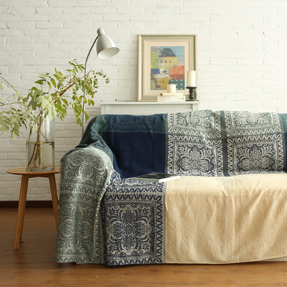 Blue / Green Knitted Bohemian Panel Tapestry Sofa Throw Cover
