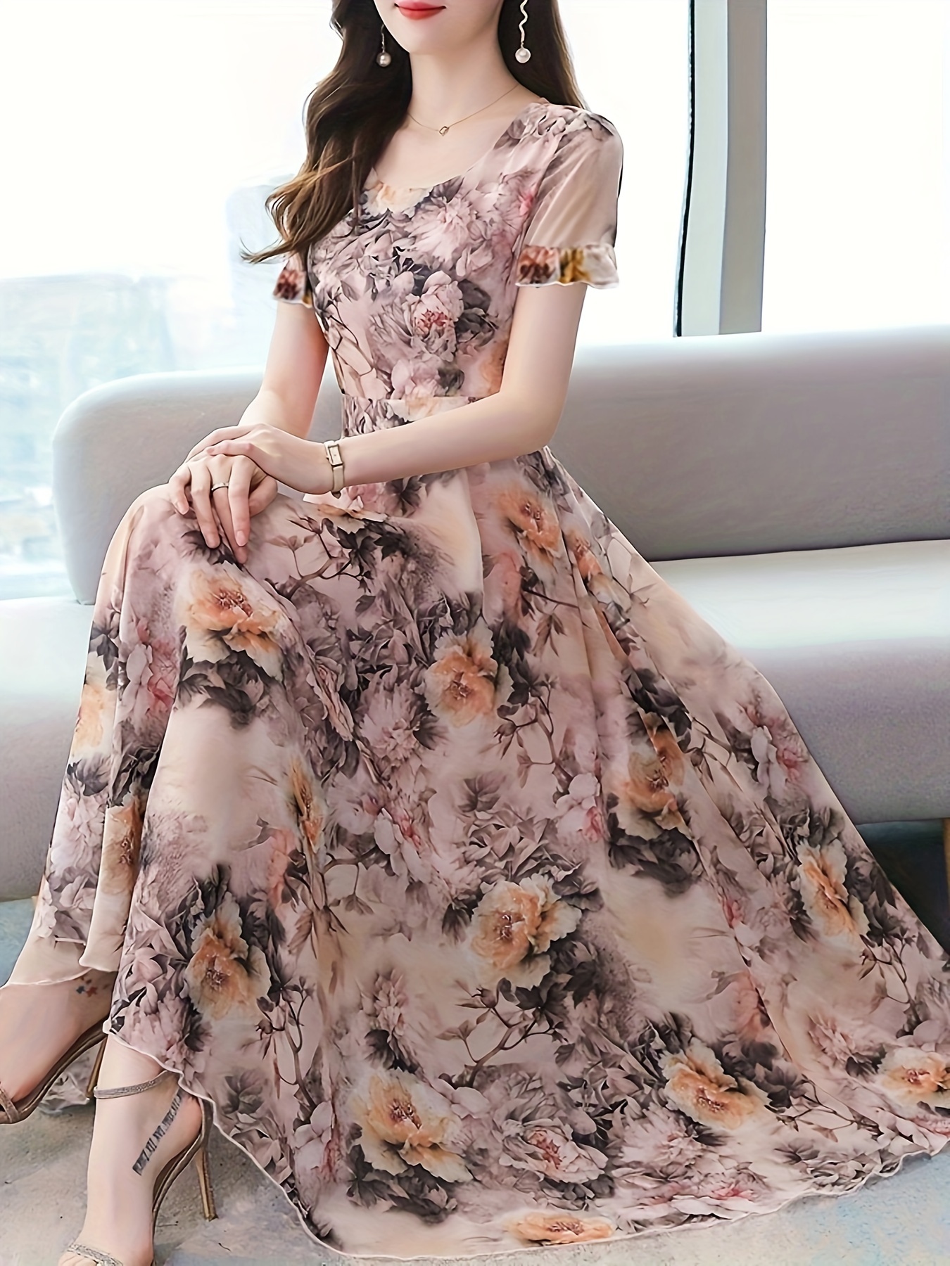 Floral Print Crew Neck Dress, Elegant Short Sleeve Dress For Spring & Summer, Women’s Clothing For Elegant Dressing