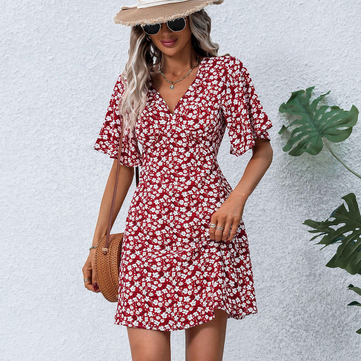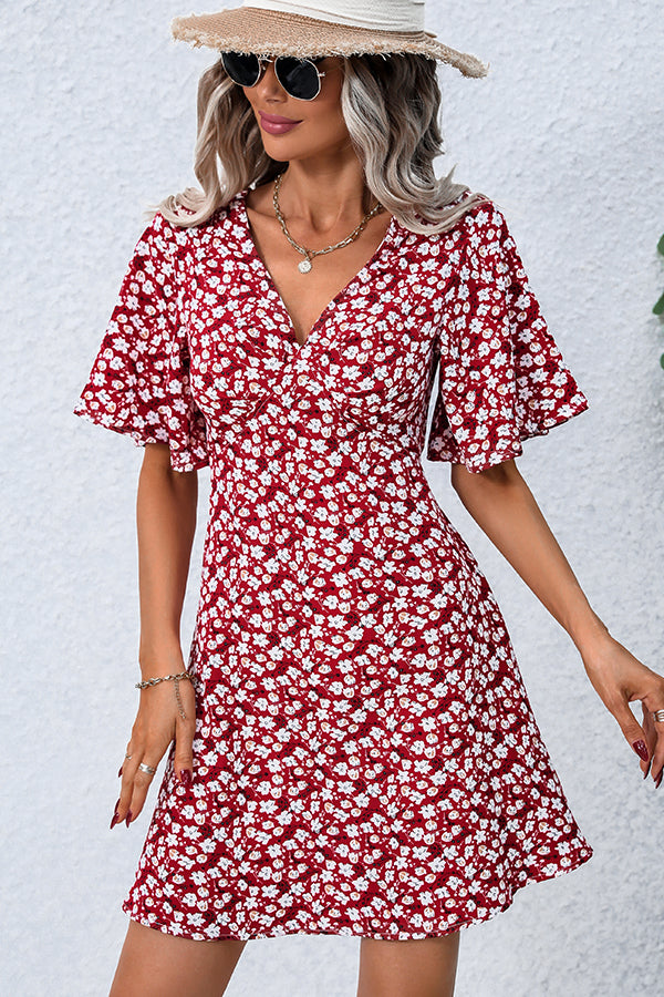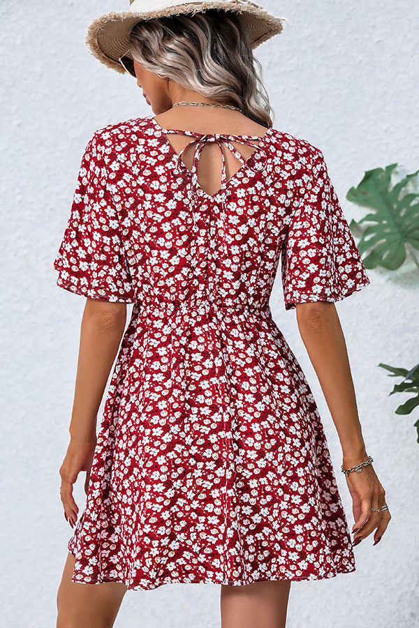 Floral Print V Neck Short Sleeve Casual Dress