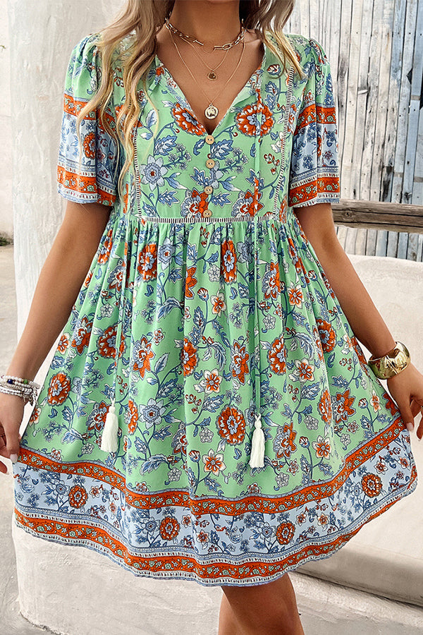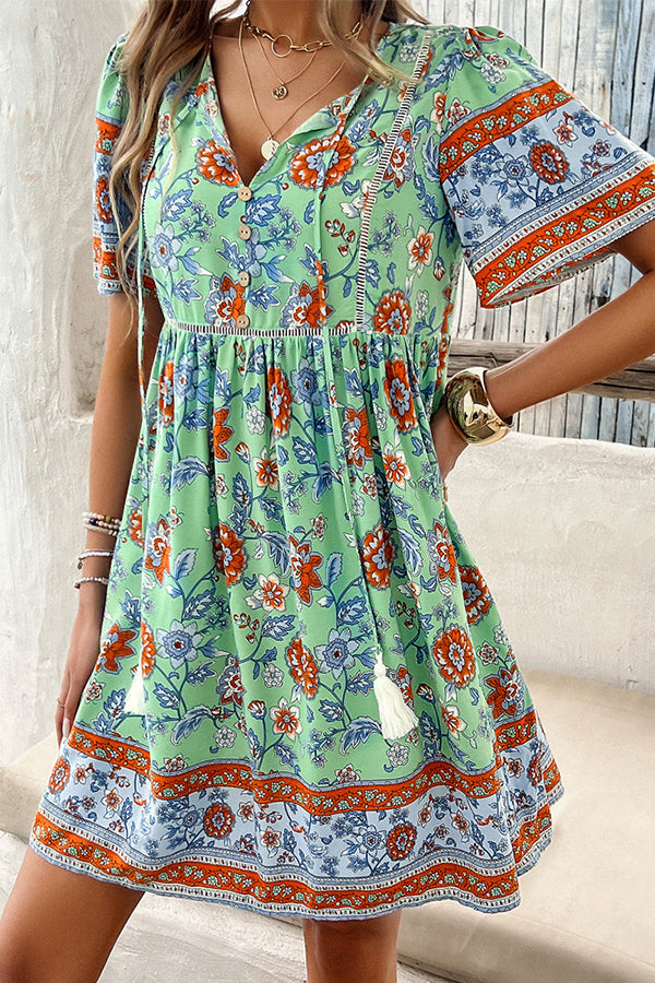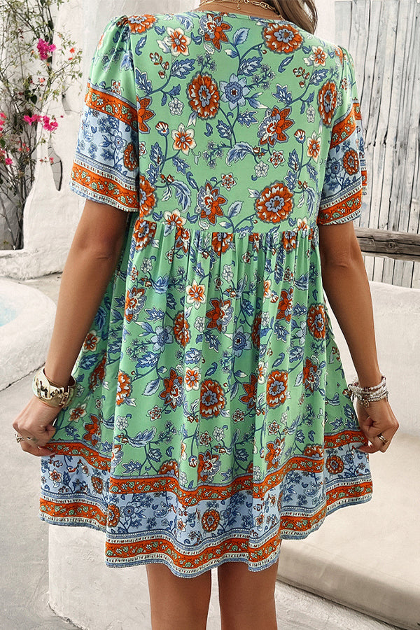 Floral Print V Neck Short Sleeve Mini Dress