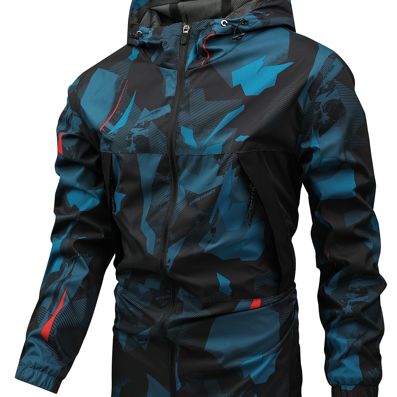Geometric Pattern Design Men’s Color Blocked Zip Up Hooded Indbreaker, Suitable For Outdoor Hiking, Camping And Travel In All Seasons