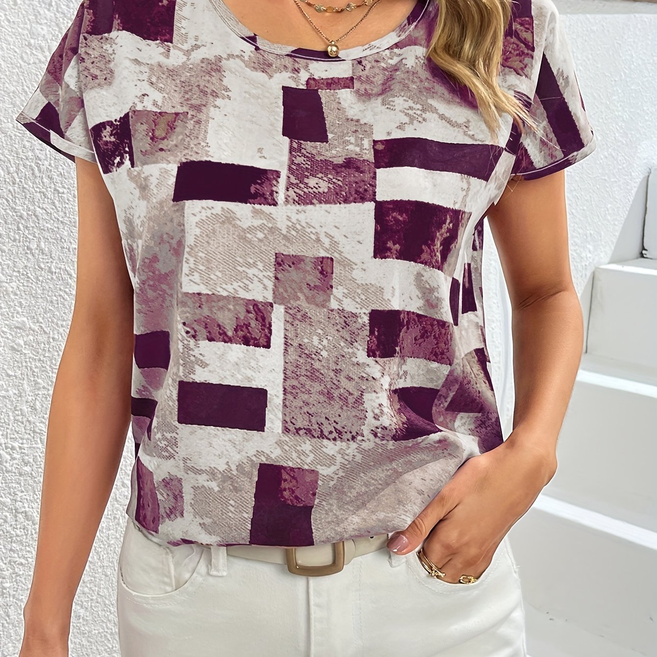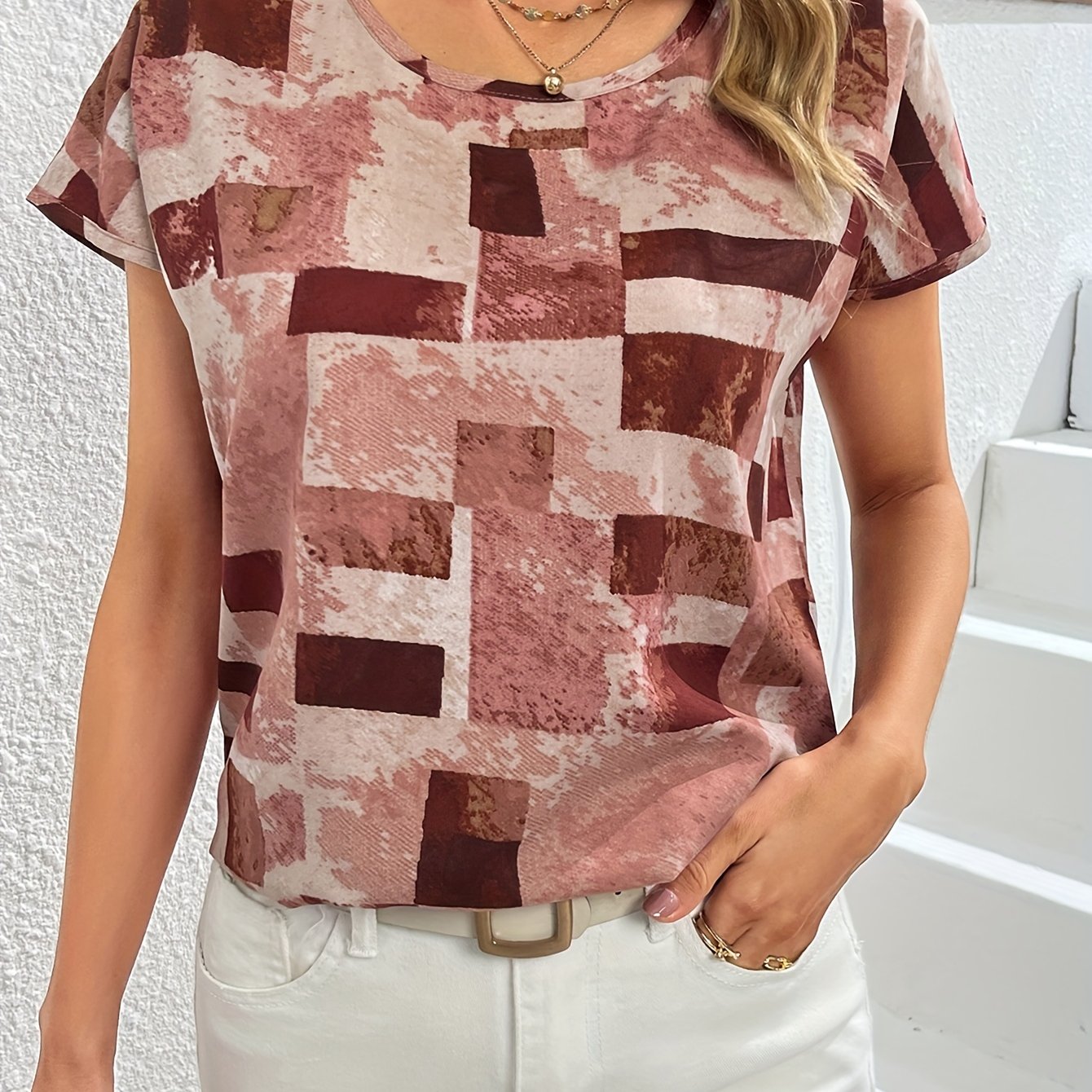 Geometric Print Blouse, Casual Crew Neck Short Sleeve Summer Blouse, Women’s Clothing