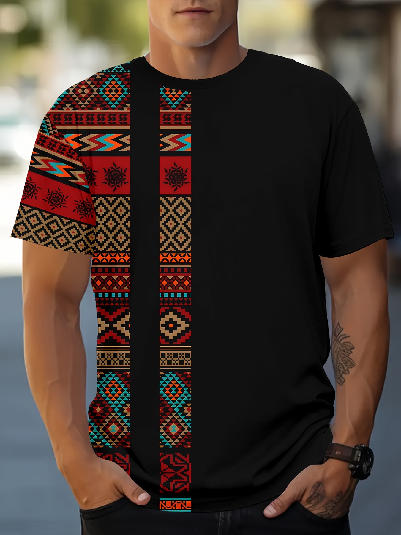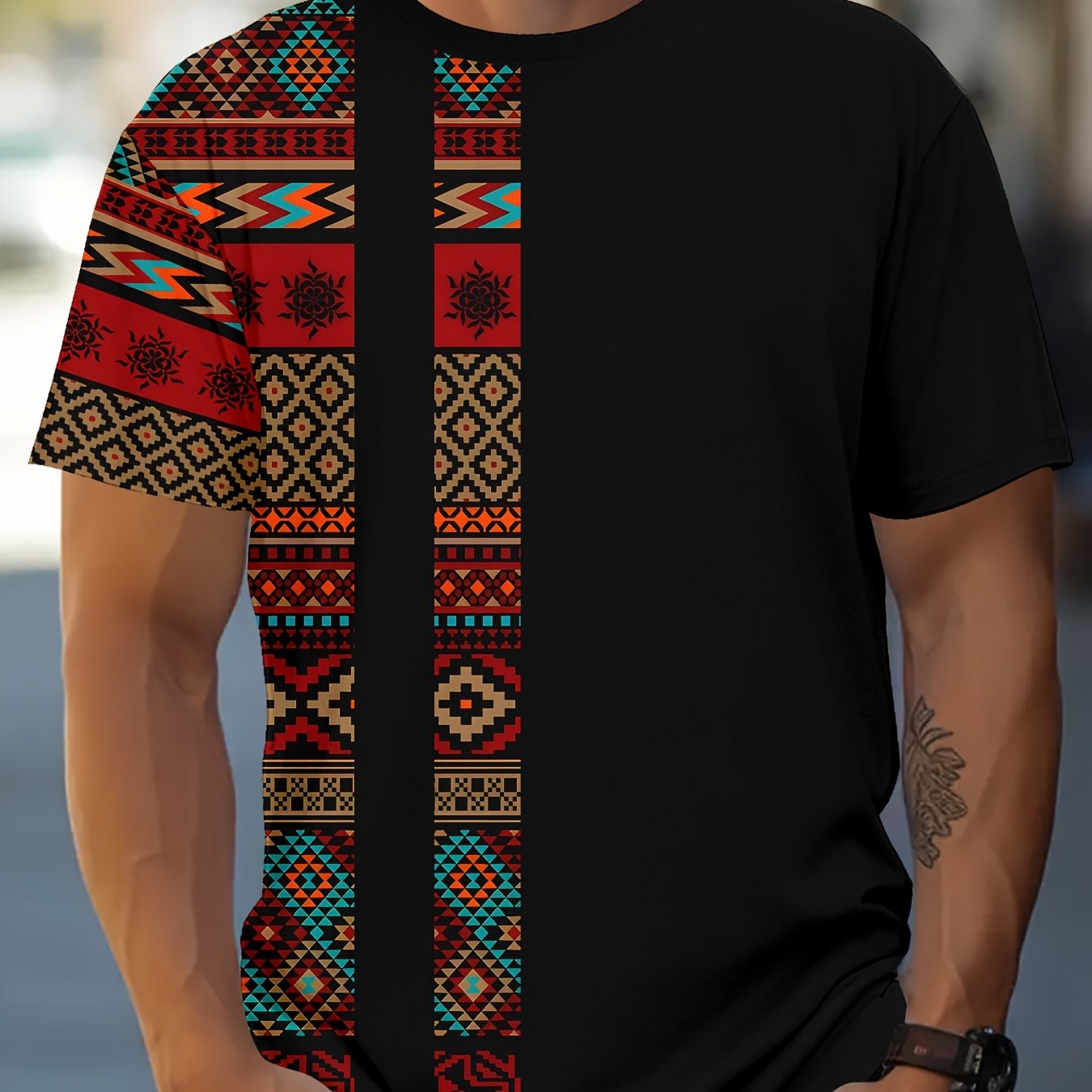 Men’s Ethnic Graphic Print T-shirt, Casual Short Sleeve Crew Neck Tee, Men’s Clothing For Summer Outdoor