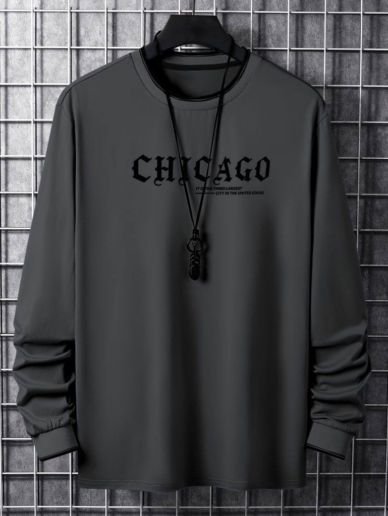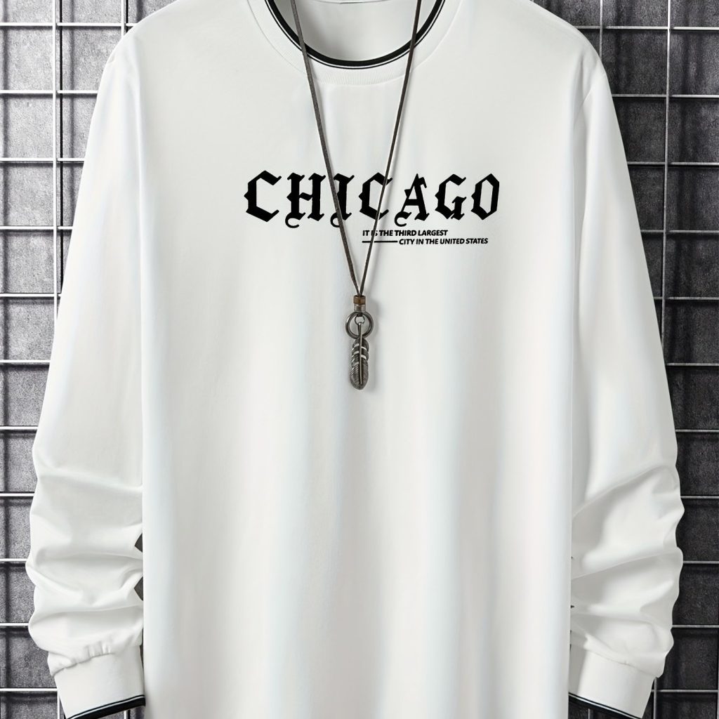 CHICAGO Print Men’s Street Daily Long Sleeve High Stretch T-shirt, Spring Fall Outdoor, Men’s Clothing