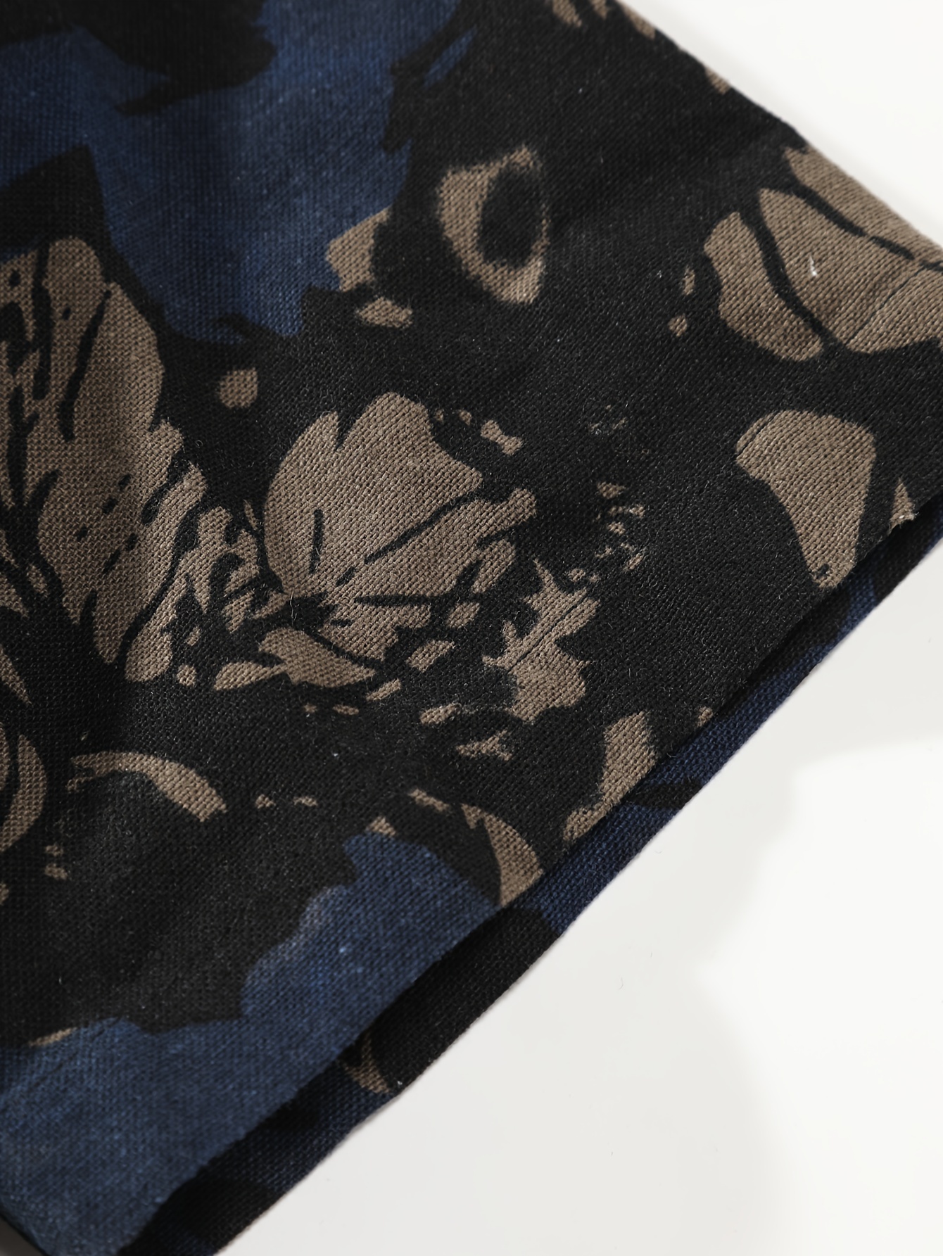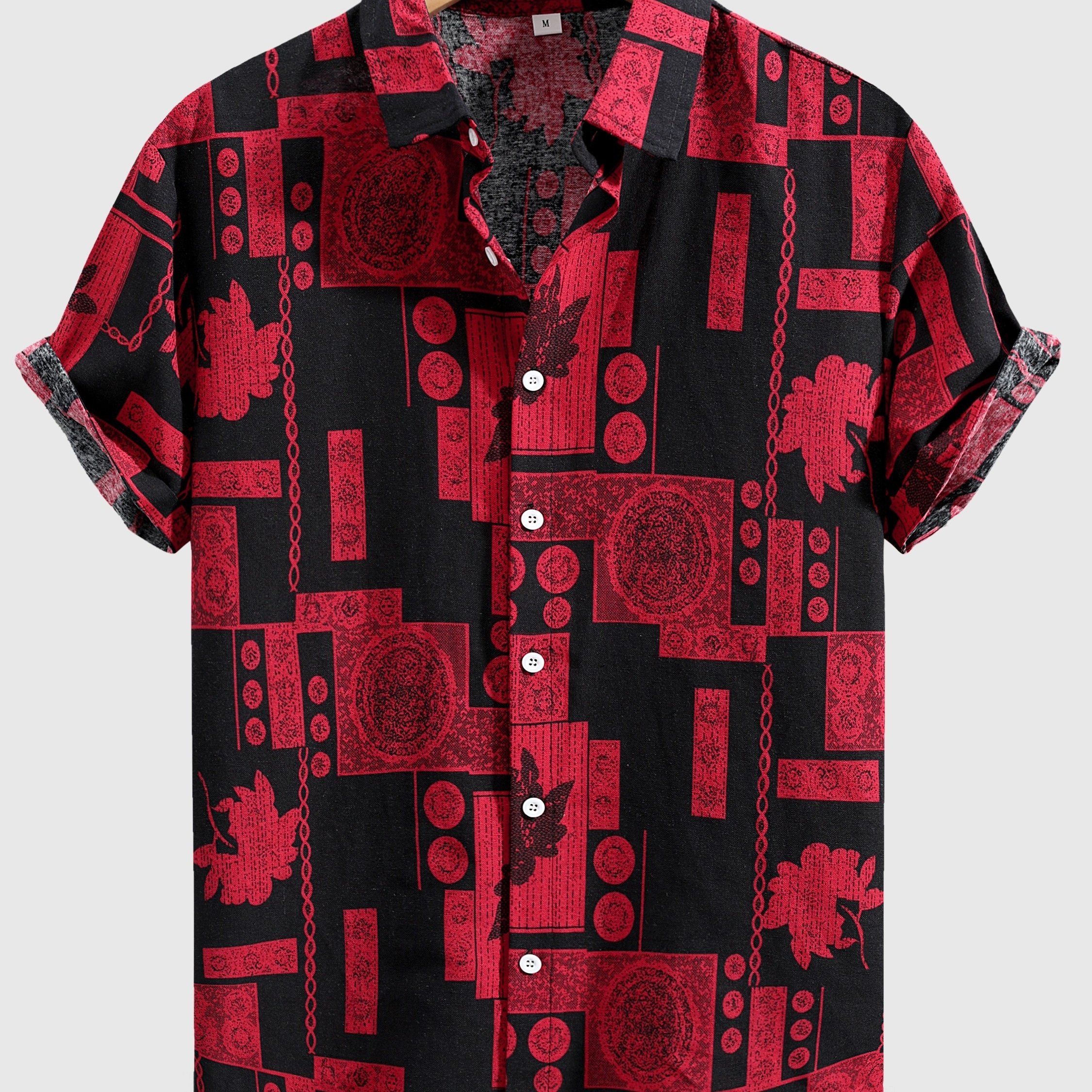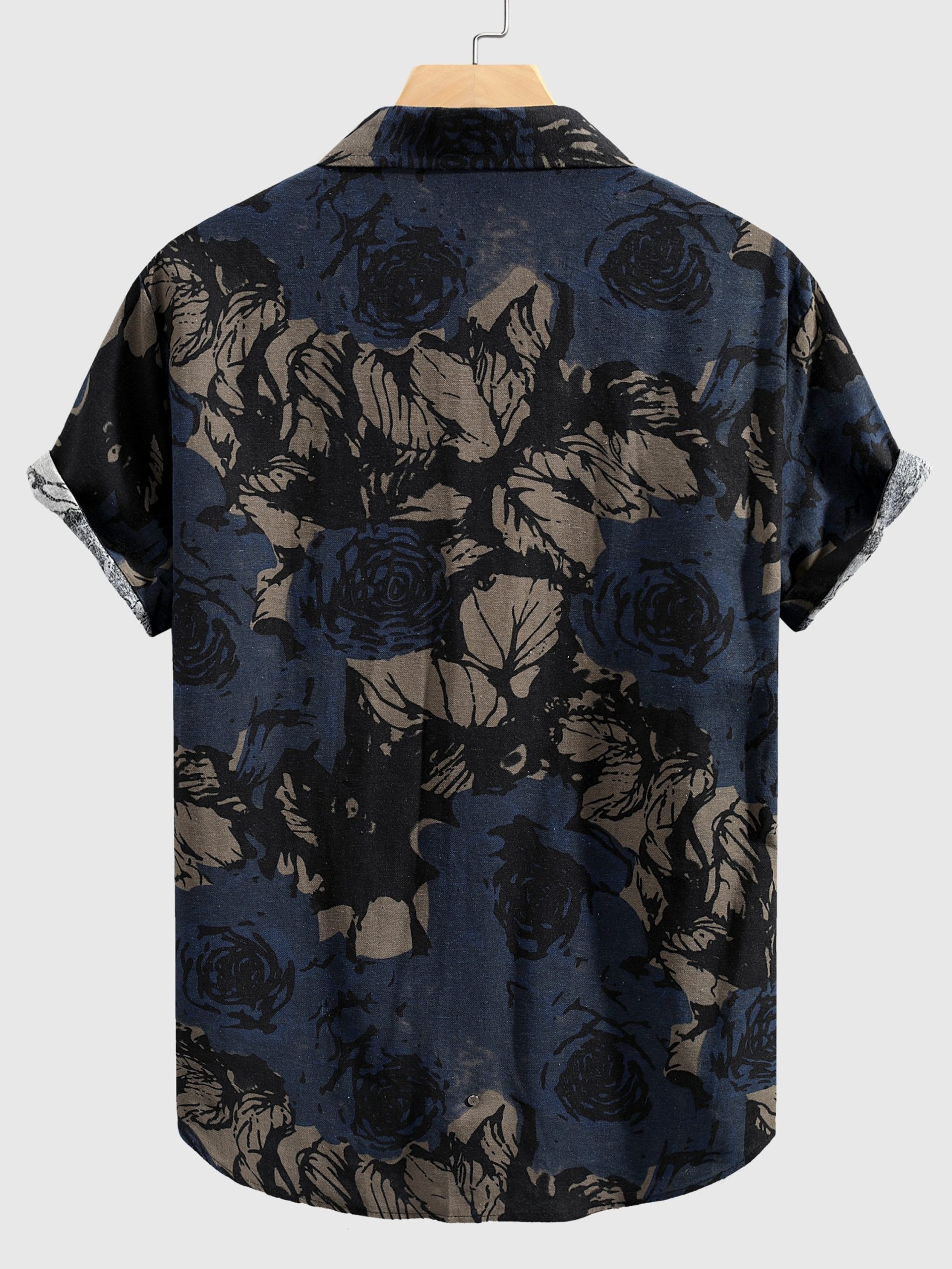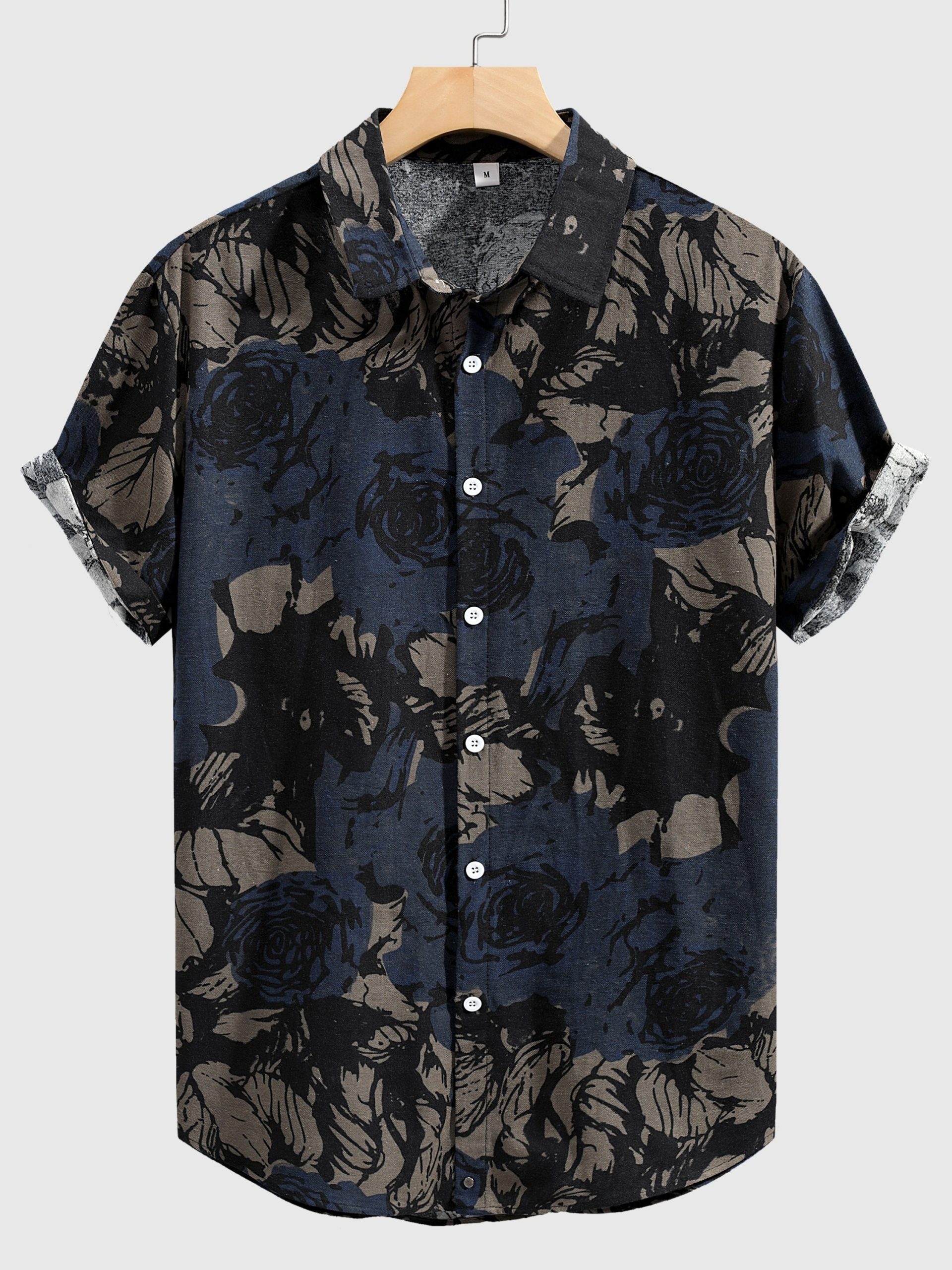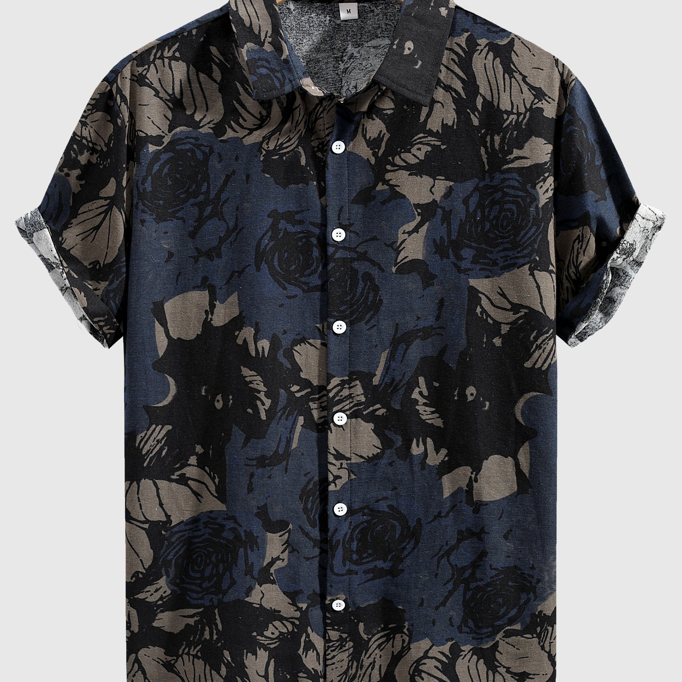 Men’s Stylish Loose Cotton Blend Floral Print Shirt, Casual Breathable Lapel Button Up Short Sleeve Shirt For Summer Outdoor Activities