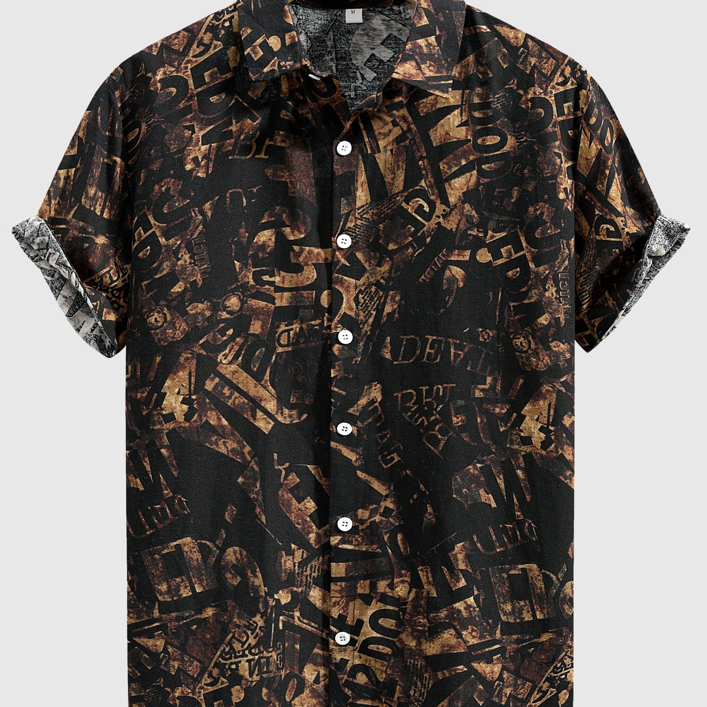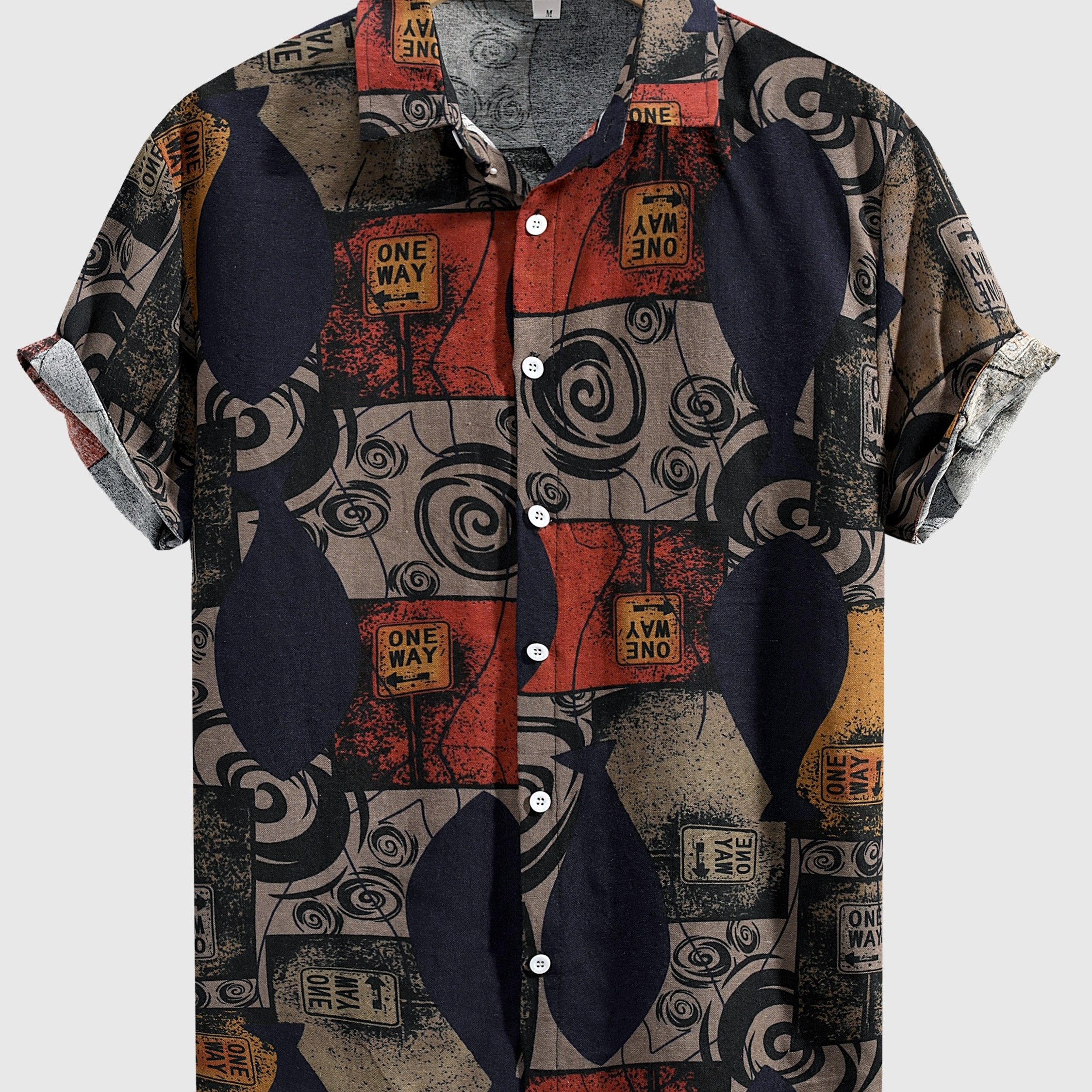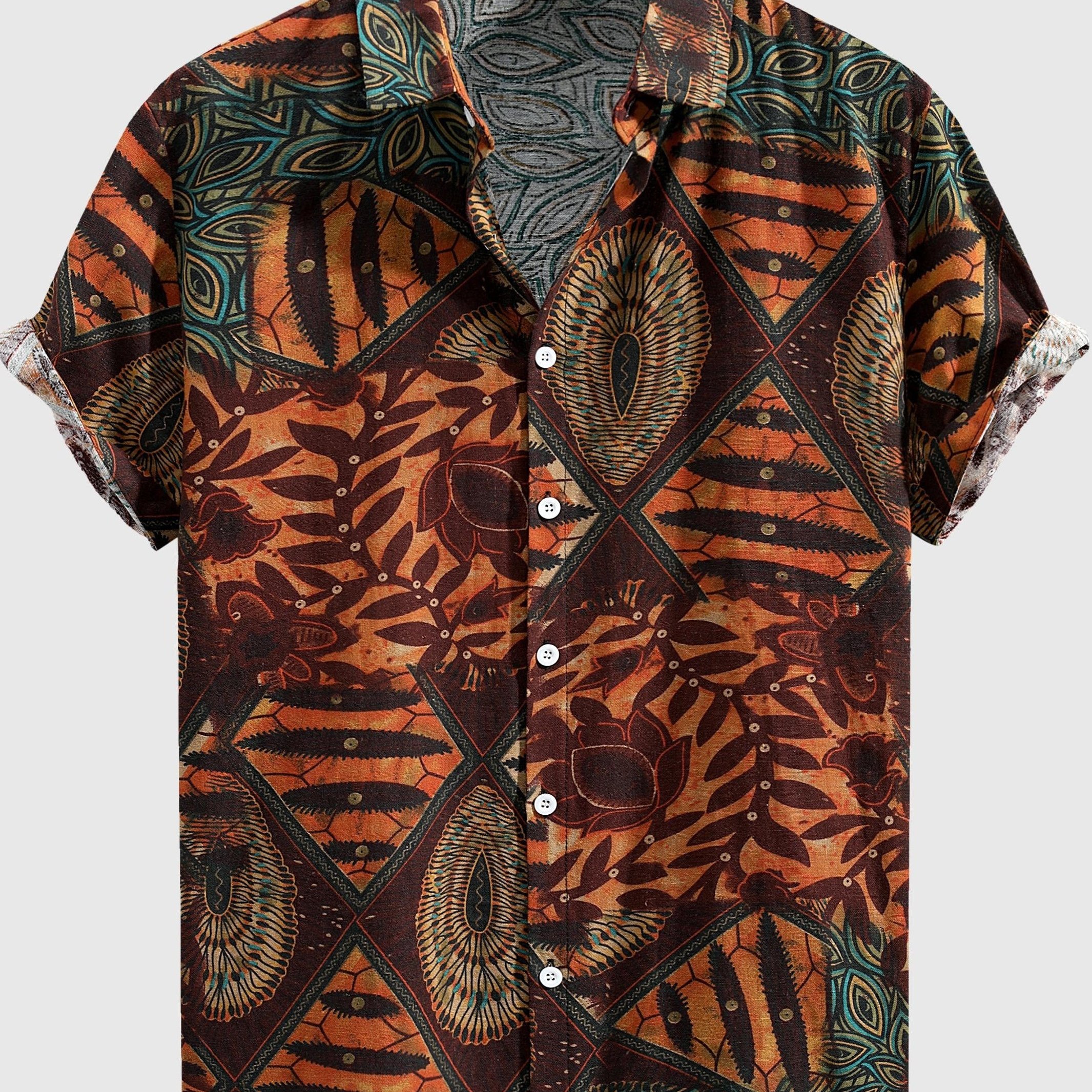 Men’s Stylish Loose Cotton Blend Geometric Print Shirt, Casual Breathable Lapel Button Up Short Sleeve Shirt For Summer Outdoor Activities