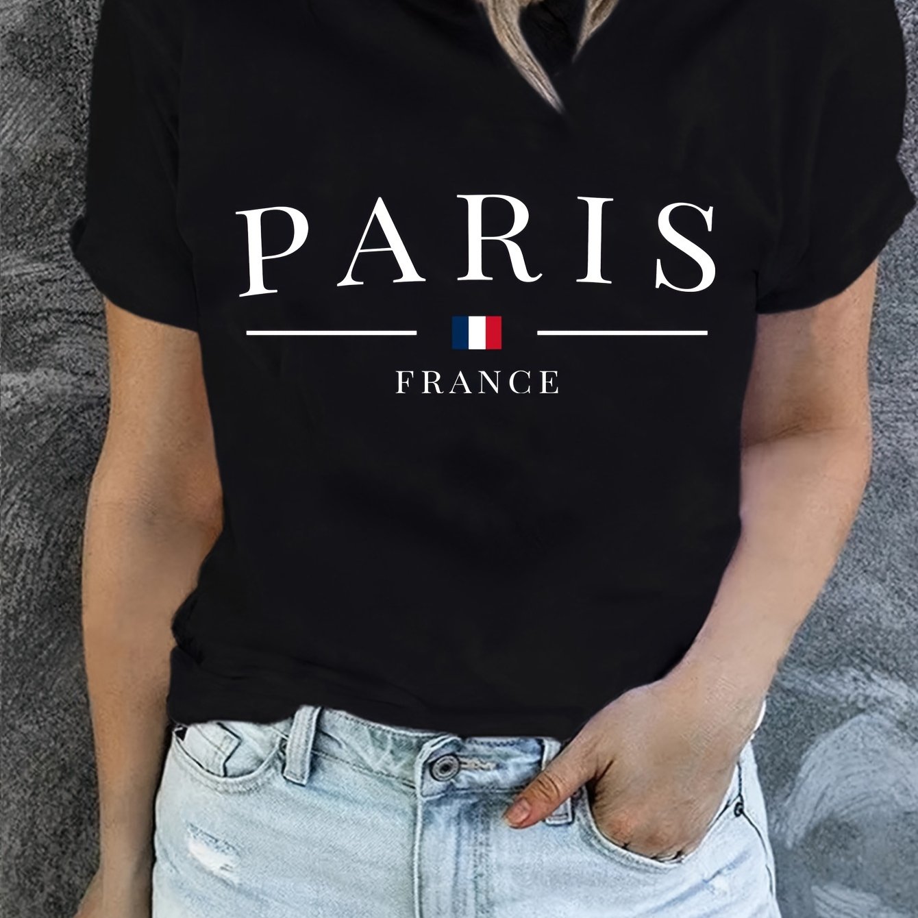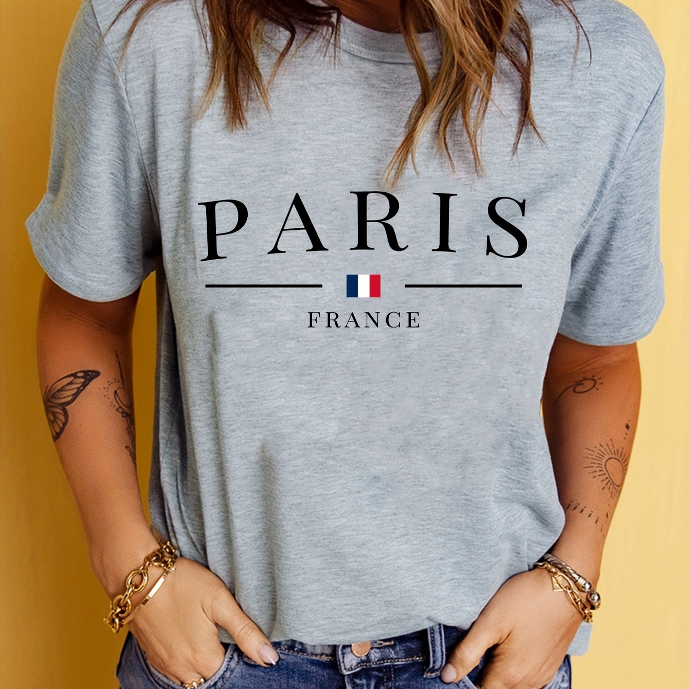 PARIS Print T-shirt, Short Sleeve Crew Neck Casual Top For Summer & Spring, Women’s Clothing