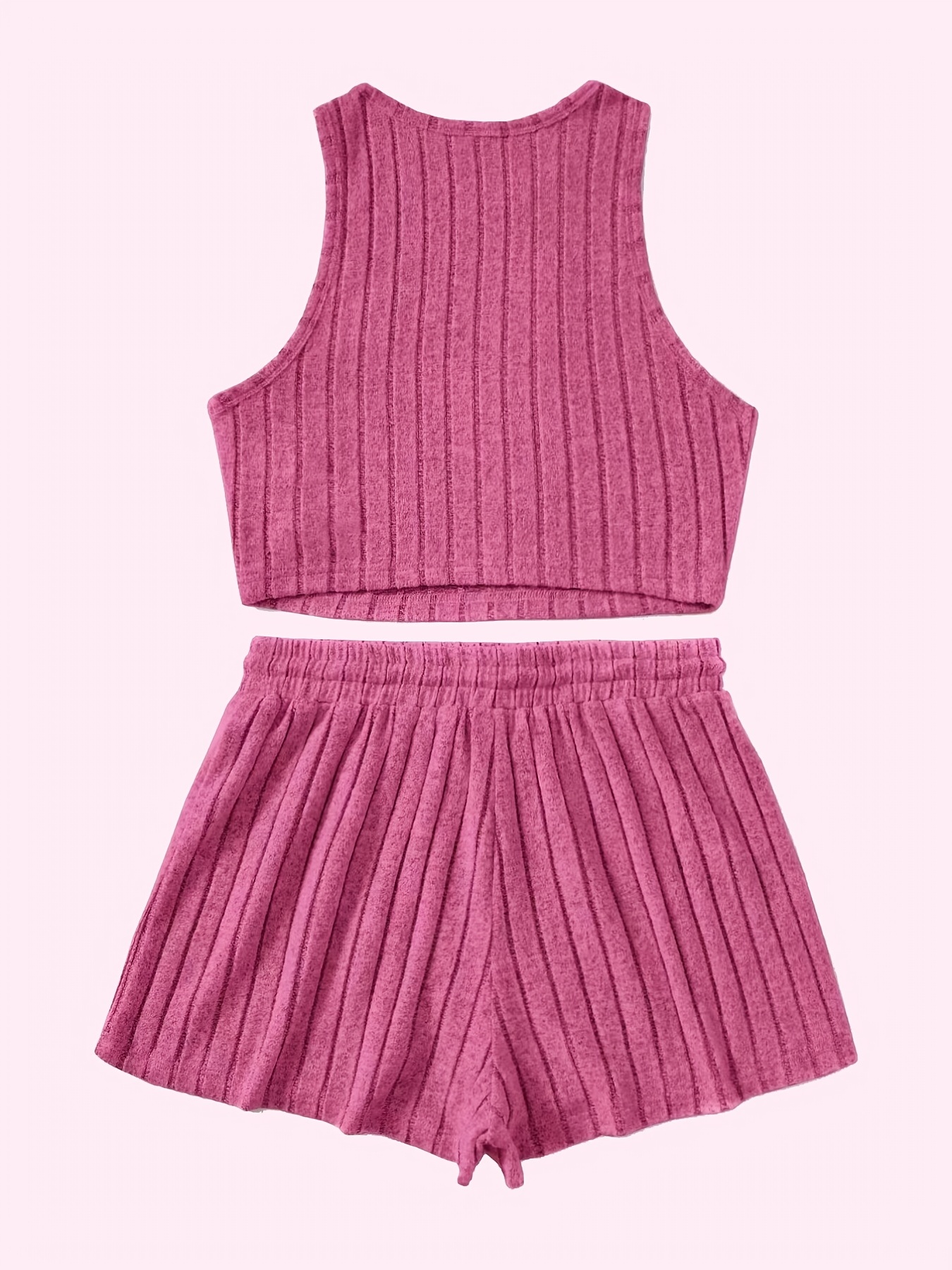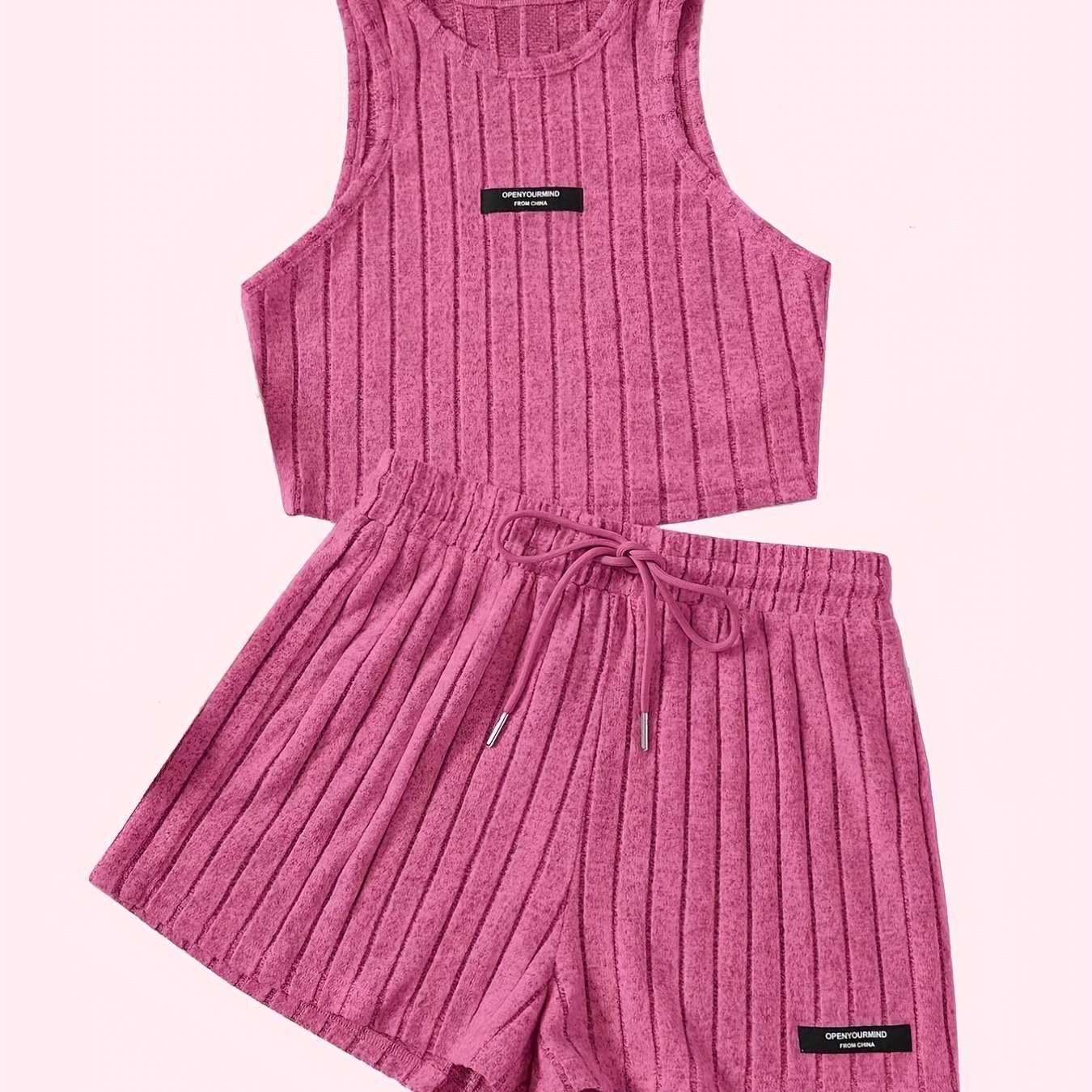 Ribbed Casual Two-piece Set, Crew Neck Sleeveless Tank Top & Drawstring Shorts Outfits, Women’s Clothing