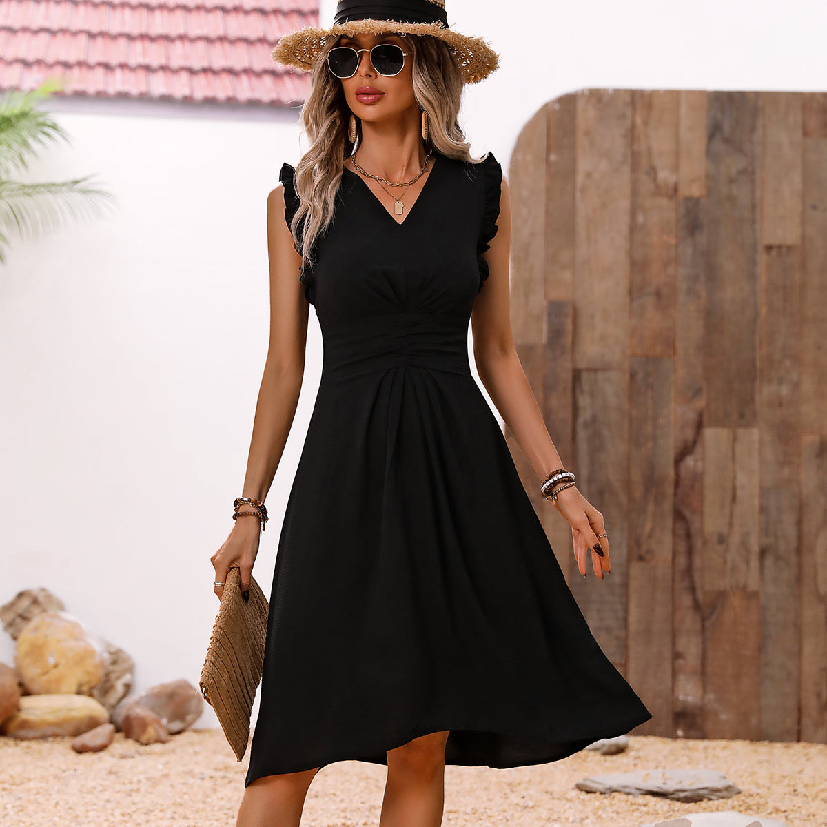 Solid Black V Neck Frill Casual Dress