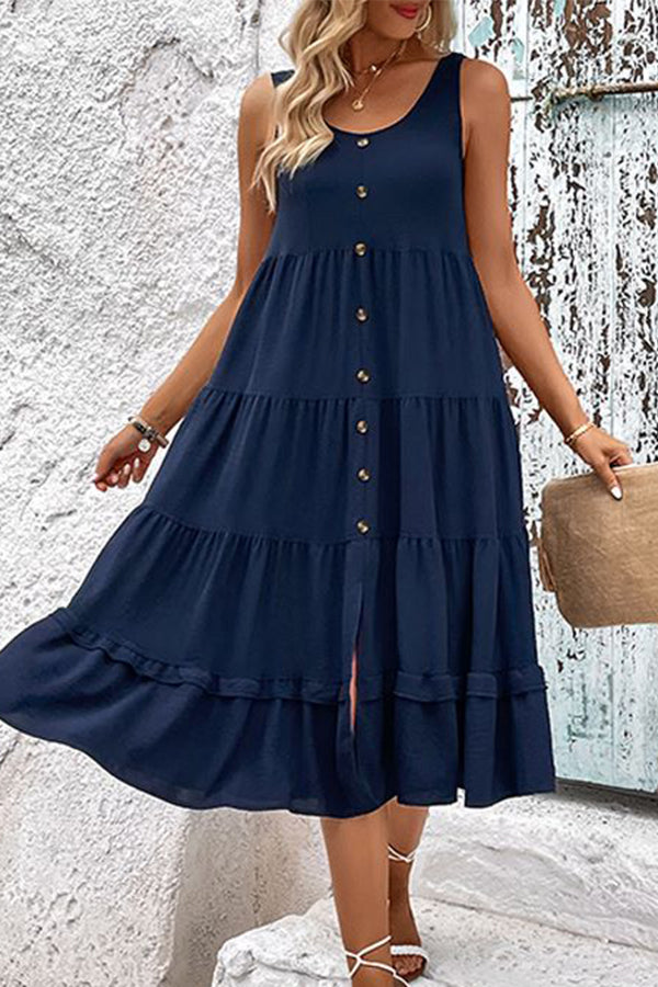Solid Color Round Neck Button Up Casual Dress