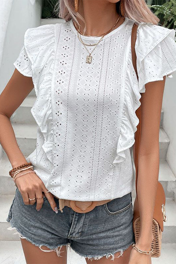 Solid Color Round Neck Ruffle Sleeve Casual Tops