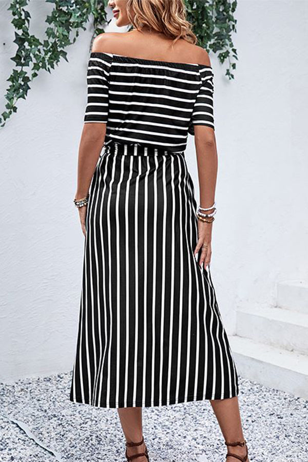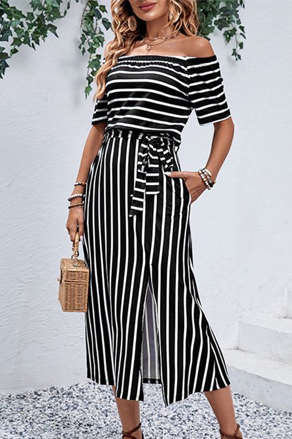 Stripe Print Off The Shoulder Split Side Dress