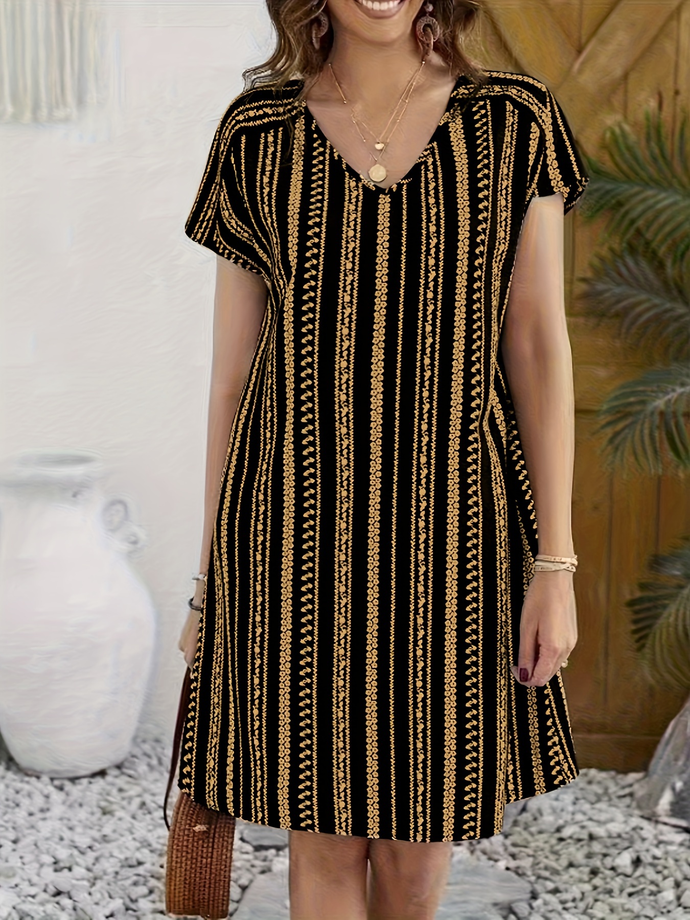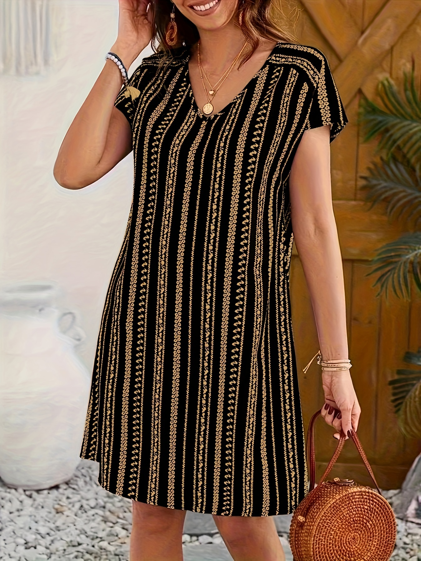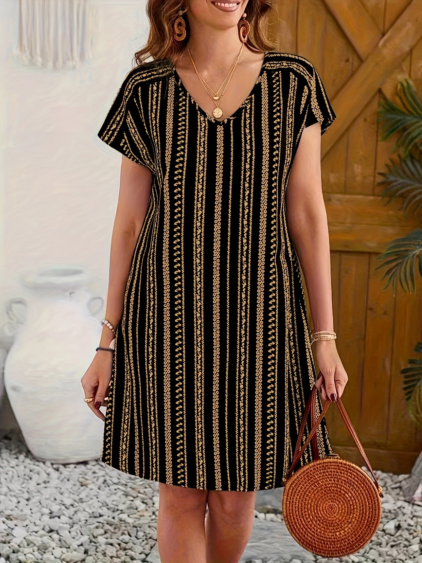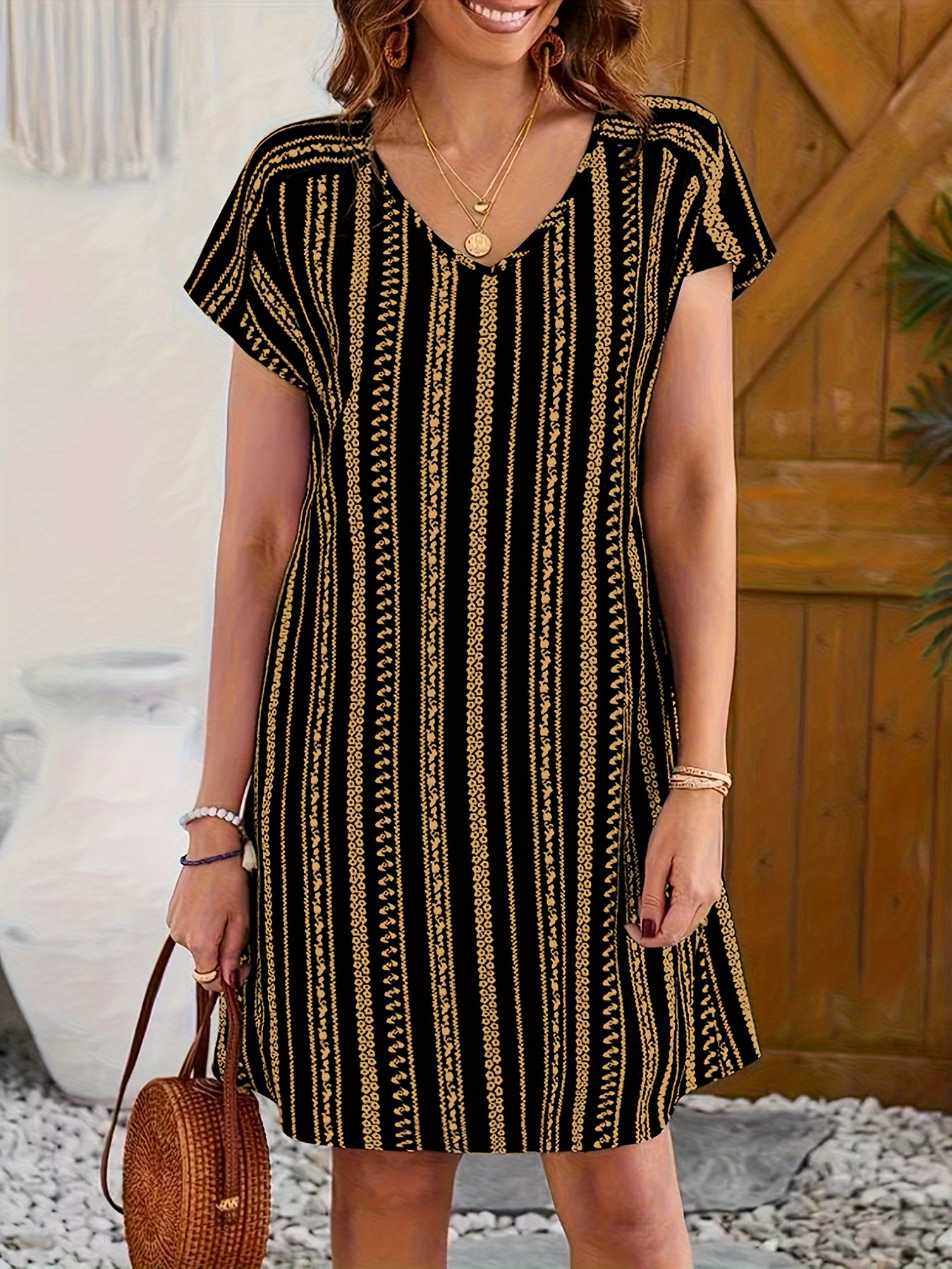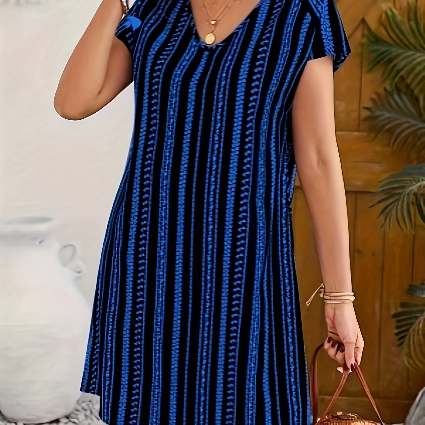Striped V-neck Dress, Vacation Style Short Sleeve Shift Dress For Spring & Summer, Women’s Clothing