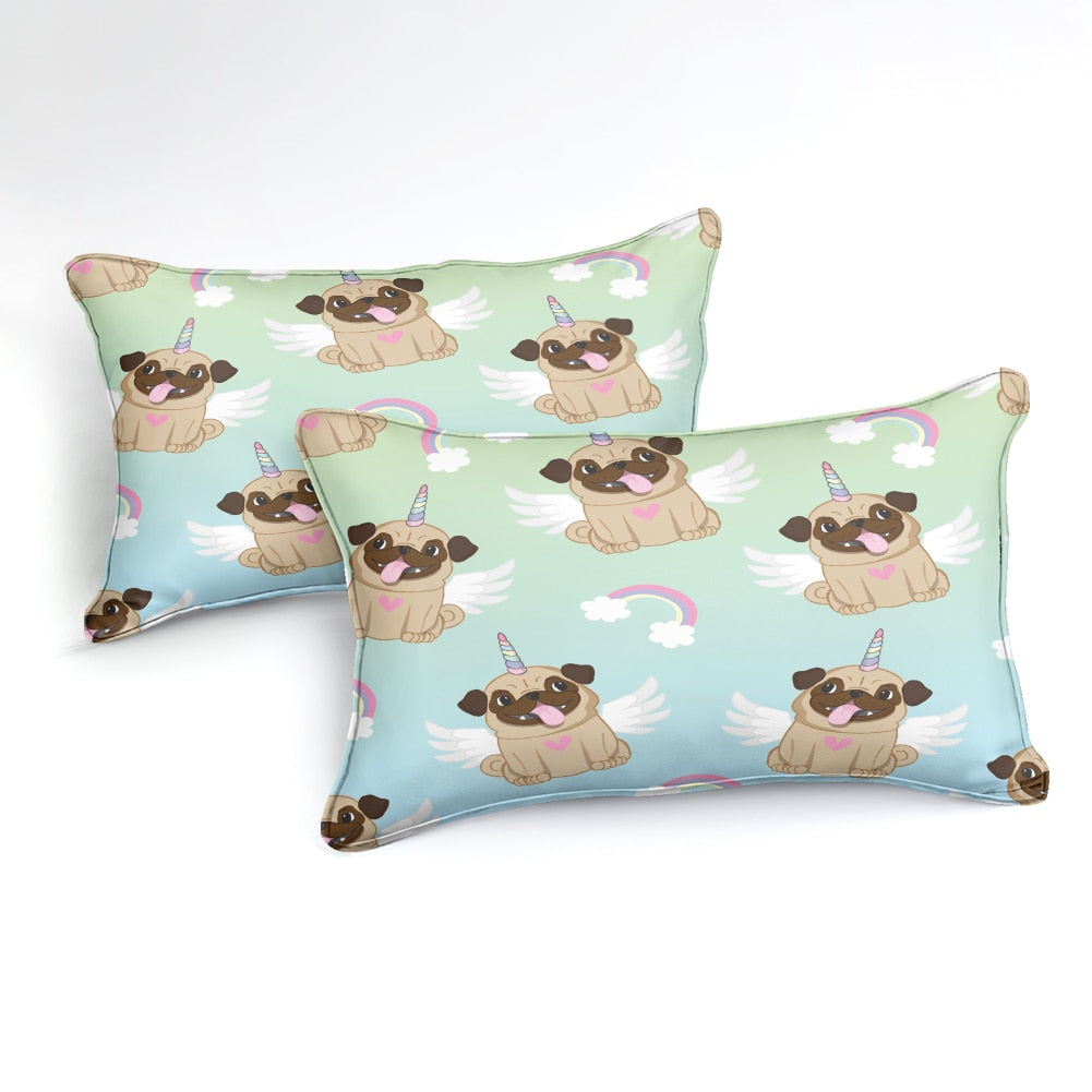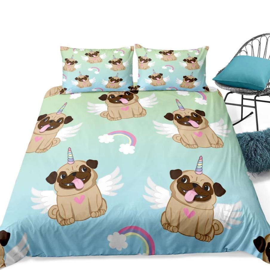 Teal 2/3-Piece Cartoon Unicorn Pug Pattern Duvet Cover Set